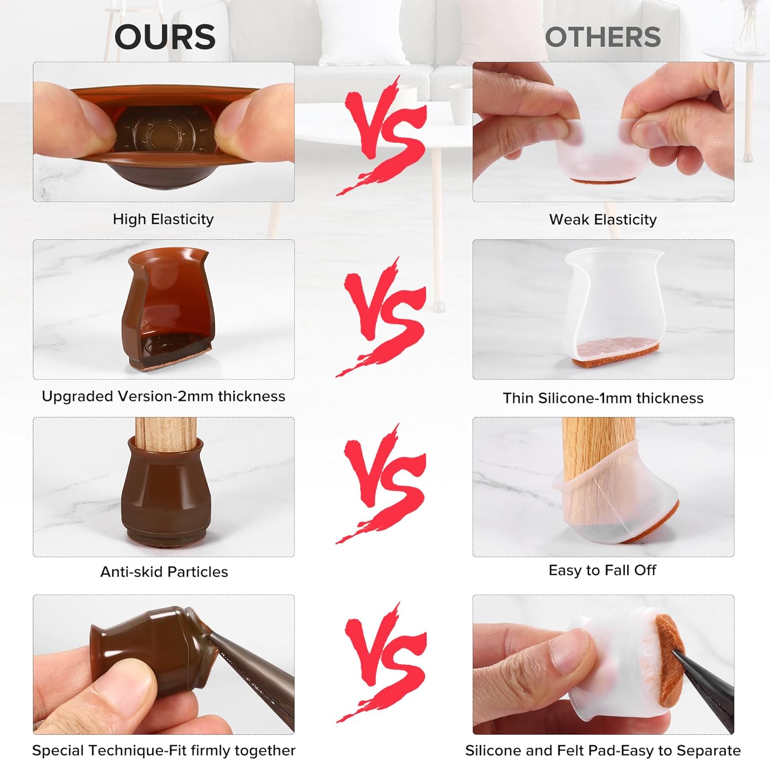 - ✅【Latest Upgrade】Compared with most of the traditional 1mm furniture pads on the market, our silicone chair leg protectors are made of 2mm thick silicone, which will never be damaged, durable. The ruby for chair legs will not change color when stretched. Inside of the inner sleeves are particles with anti-slip, which will firmly fix the chair and never make the covers fall off. Felt pads at the bottom make your furniture move silently and smoothly along floors without leaving marks and noise.