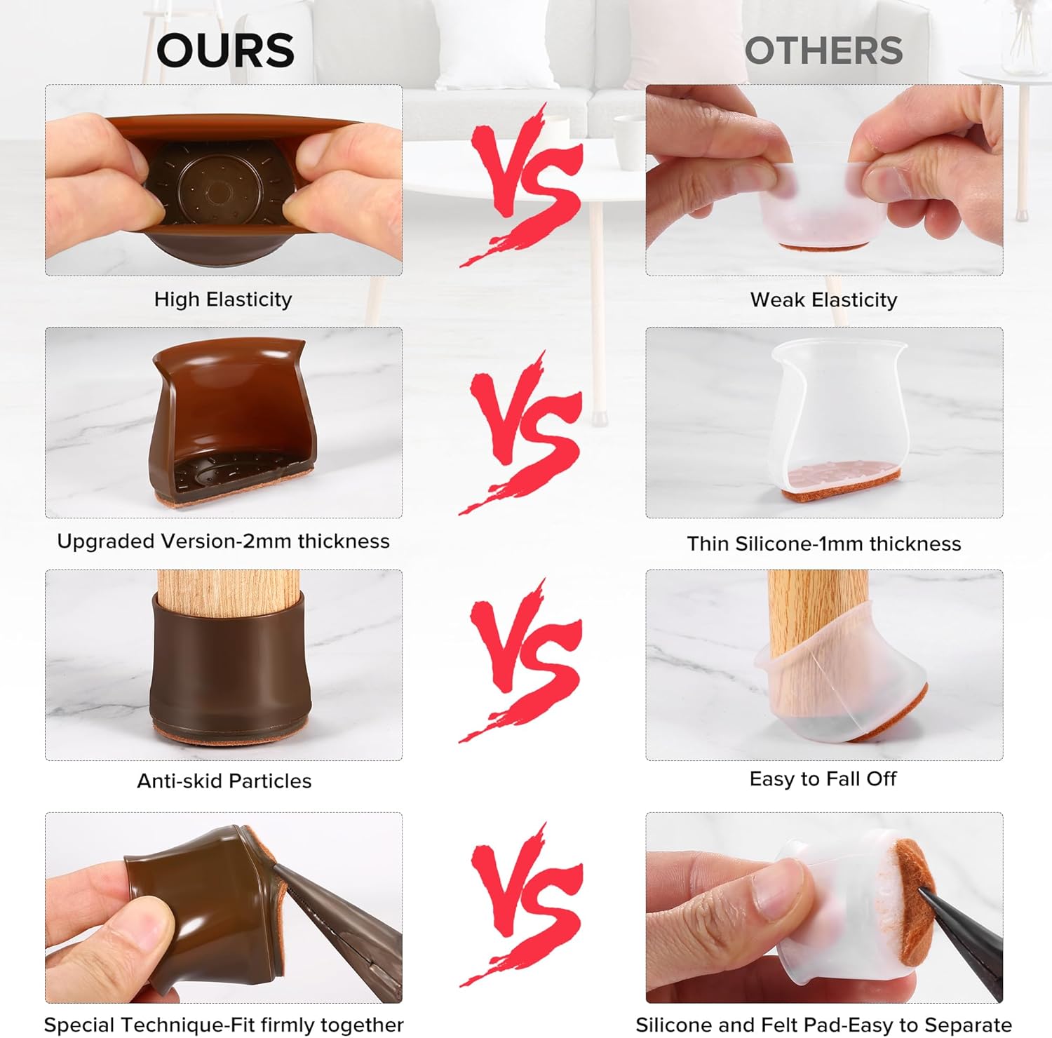 - ✅【Latest Upgrade】Compared with most of the traditional 1mm furniture pads on the market, our silicone chair leg protectors are made of 2mm thick silicone, which will never be damaged, durable. The ruby for chair legs will not change color when stretched. Inside of the inner sleeves are particles with anti-slip, which will firmly fix the chair and never make the covers fall off. Felt pads at the bottom make your furniture move silently and smoothly along floors without leaving marks and noise.