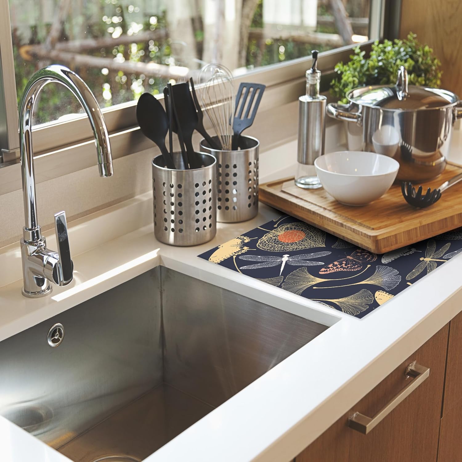 Ginkgo Leaves Dish Drying Rack Mat for Kitchen Counter,Dragonfly Butterfly Dish Drying Pad Absorbent Reversible Microfiber Protector for Coffee Bar Sink Countertops 18x24 Inch