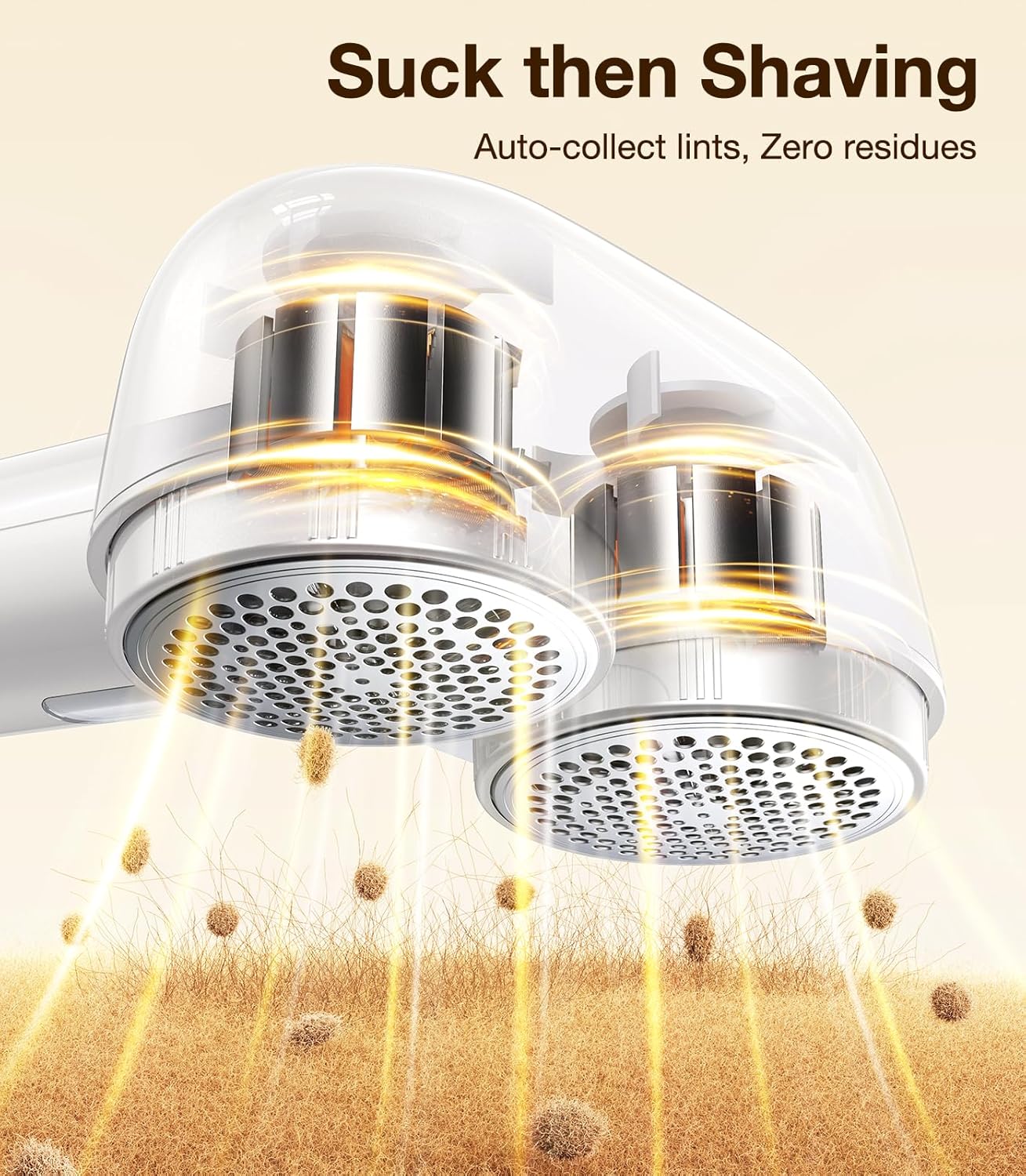 - 【2 in 1 Trim and Suction Efficiently】Redefine fabric shaver. This lint remover can trim and suck in pillings at the same time. Offering a powerful suction with a 360 cyclone convection technology, easily sucking up all fuzz trimmed and leaving fabric clean like new. Eliminate the secondary breeding of pillings. Once shaved, the clothes and environment are clean immediately. We can see clearly how many pillings we removed through the visible lint collector bin.