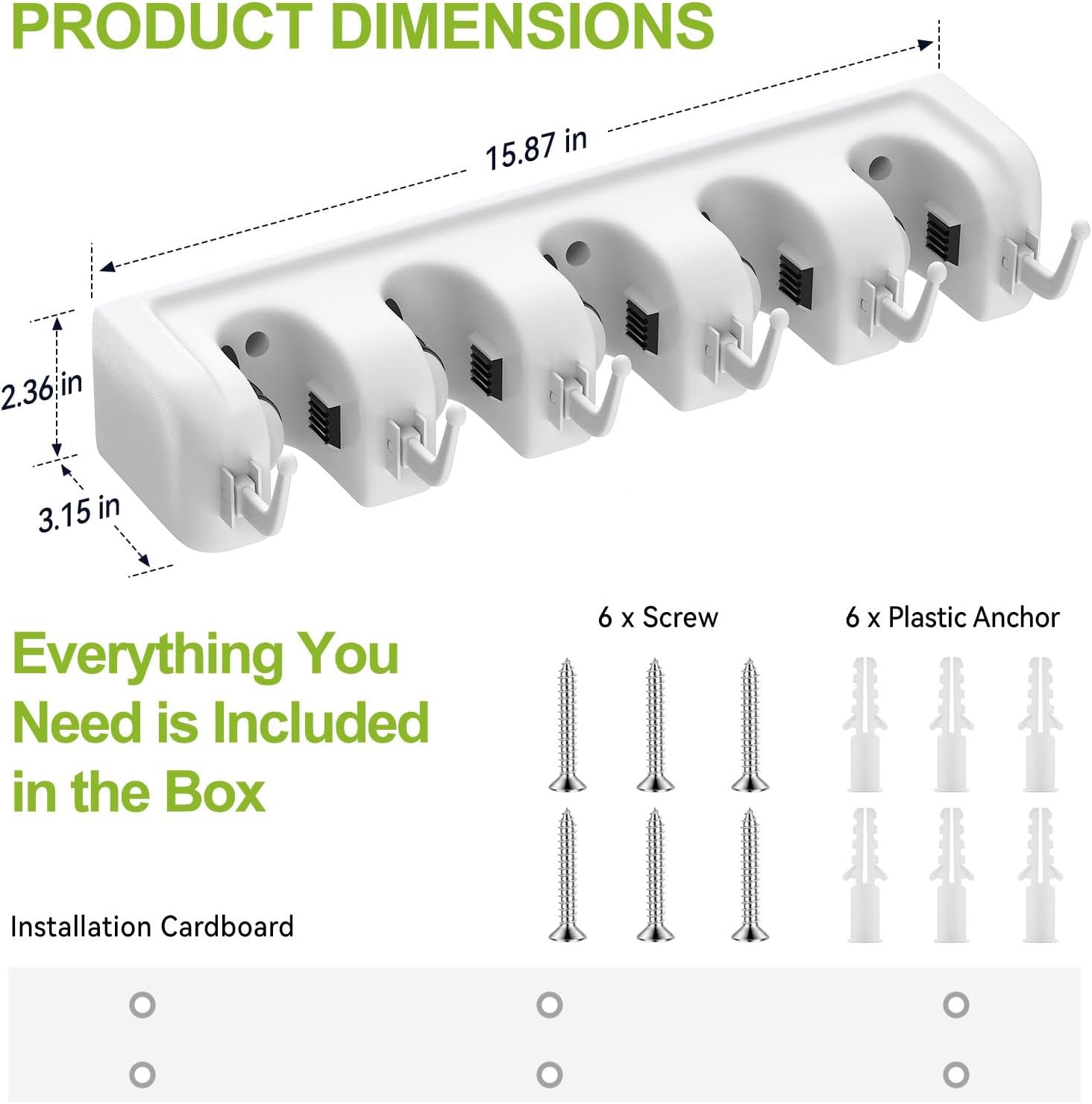 • Easy Installation in Minutes - Included with wall mounted broom holders are all the stainless steel screws and anchors, along with clear step-by-step instructions that allow even the clumsiest of us can install broom and mop organizer wall hanging easily in just minutes!