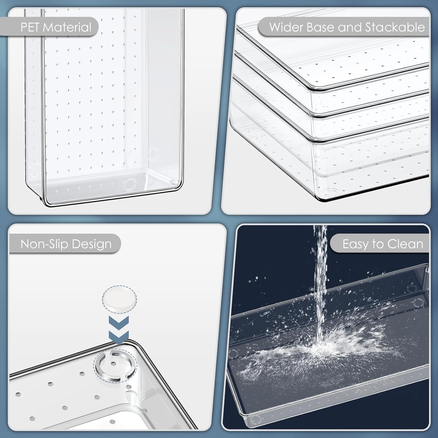- 【Stackable and Non-slip Design】Our plastic drawer organizers come with enough non-slip silicone pads. They will hold these organizers firmly in place on the drawer or desk. When not in use, these organizers can be stacked together to save your storage space.