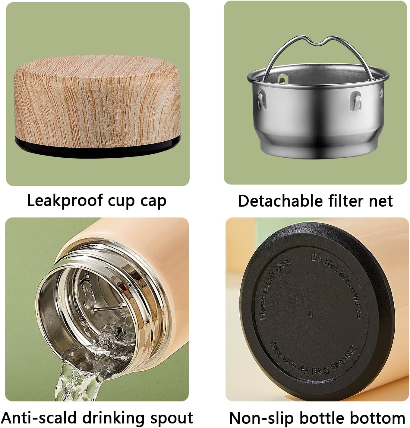 - 【EASY TO CLEAN】The inside of the lid is embedded with PP leak-proof silicone ring. Simple structure, washable with a spout removed,The cup mouth is smooth, it will not cut lips, the cup has large diameter, It has detachable filter net, can filter the residue such as tea. The bottom of the cup is made of non-slip material, which is not easy to slip off and is durable.