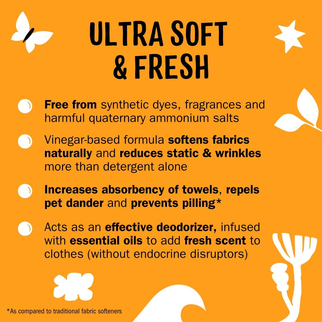 • SOFT, STATIC FREE CLOTHES: Unlike traditional fabric softeners that can deposit residues on clothes, Molly’s Suds vinegar-powered Fabric Softener uses simple ingredients (no harmful quaternary ammonium compounds!) to leave clothes feeling fresh, cozy, and comfy. Ideal for sensitive skin, the planet, and all washing machines. Our clean formula reduces static and wrinkles more than detergent alone, so you and your family can look and feel your best.