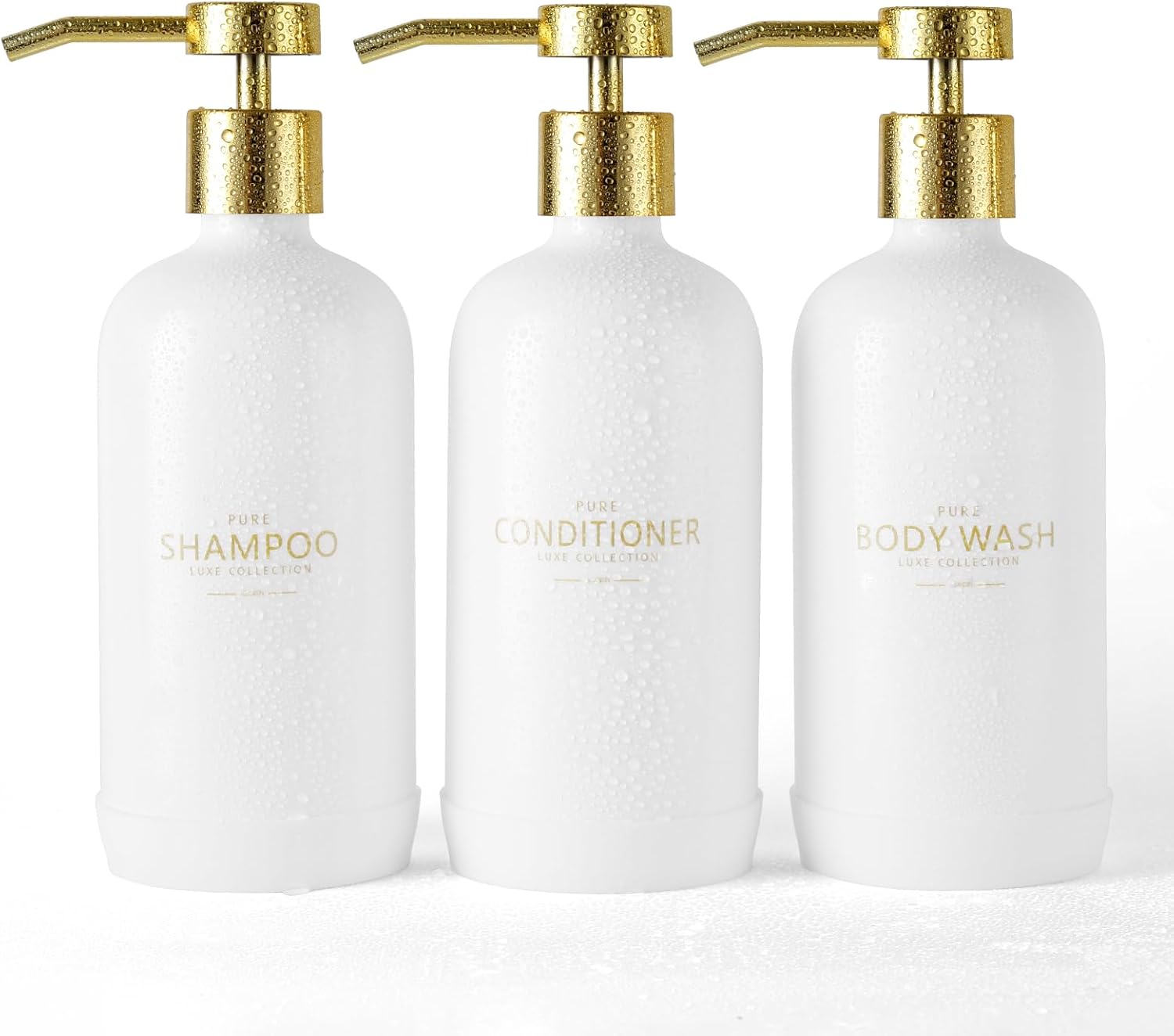 - Value Shower Dispenser Set-Organize your bathroom in a stylish and luxurious way! This set Includes 3Pcs 20.5Oz thickened BPA free plastic bottles with Reliable Pump,1 Premium Silicone Soap Holder,3 silicone trays,18 premium waterproof labels in two styles(SHAMPOO, CONDITIONER, BODY WASH,HAND SOAP,DISH SOAP,LOTION)