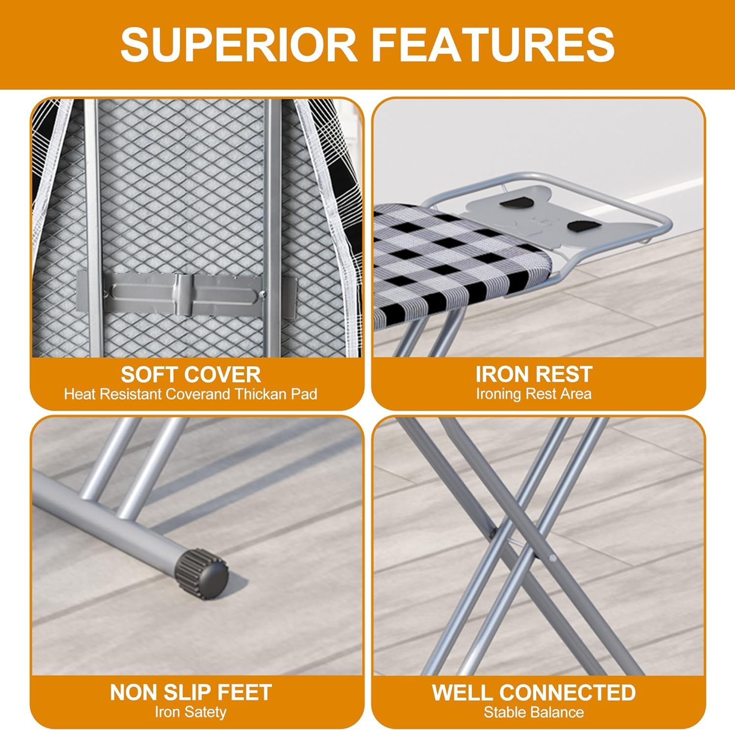 • Non-slip metal legs, locked feet design and strong long-lasting connections provide exceptional rigidity when the board is in use.The metal mesh top will allow steam to pass through and evaporate, The ironing board panel is not easy to rot like particleboard, it can breathe and dissipate heat quickly with the help of steel mesh design.