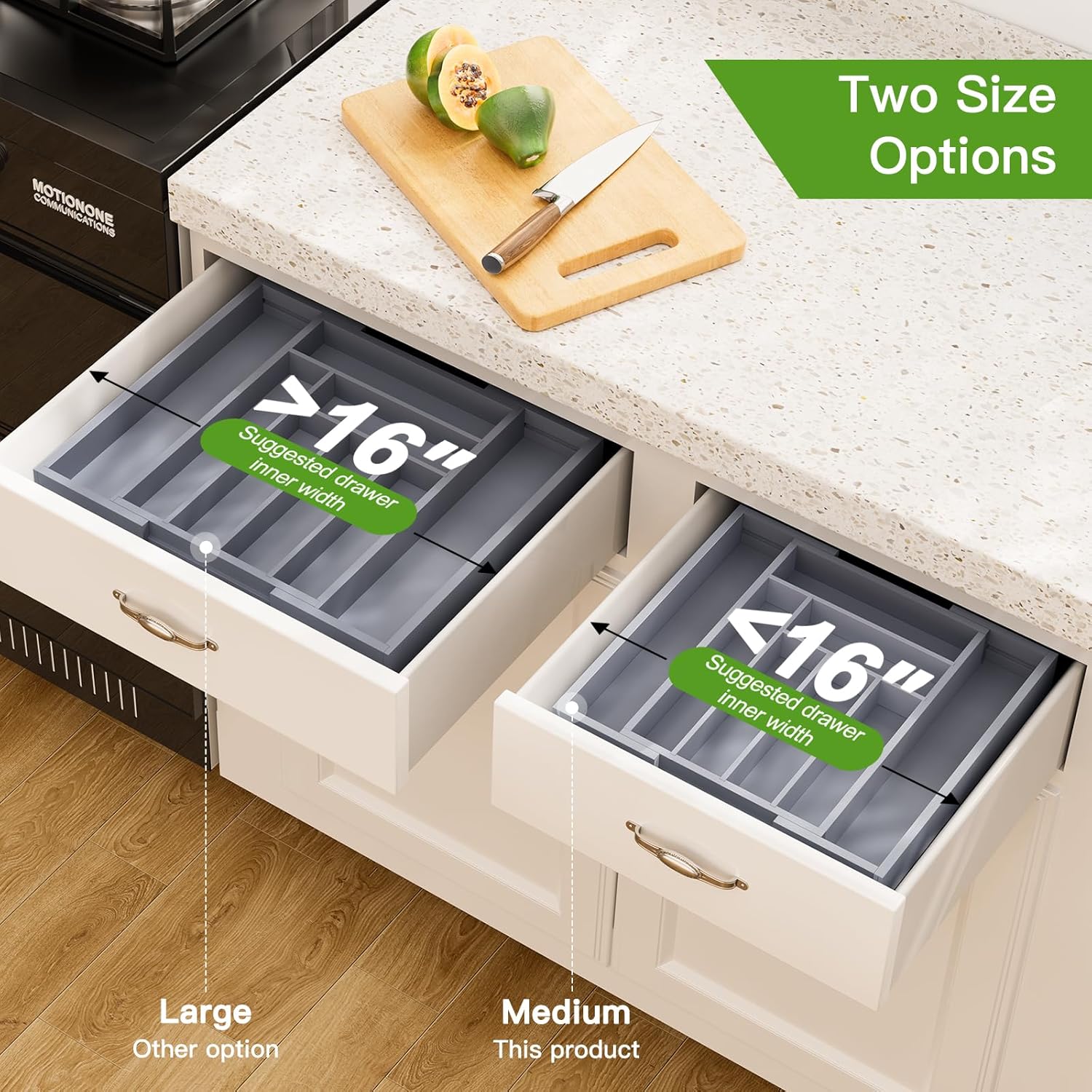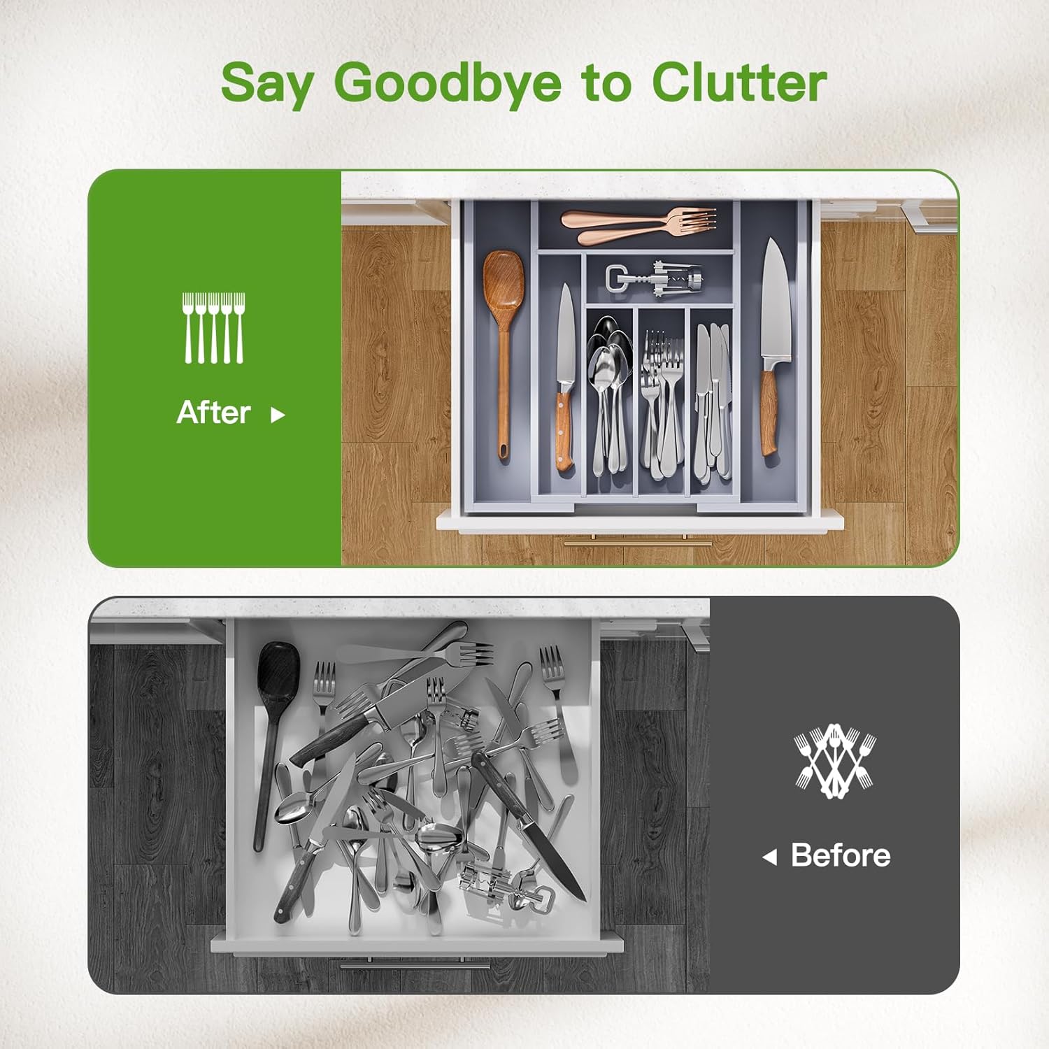 • Expandable and Adjustable Utensil Organizer: Designed with 6-8 compartments, the silverware organizer can save space while accommodating multiple items, which is expandable from 10.31 inches to 16.54 inches wide with smooth sliding.