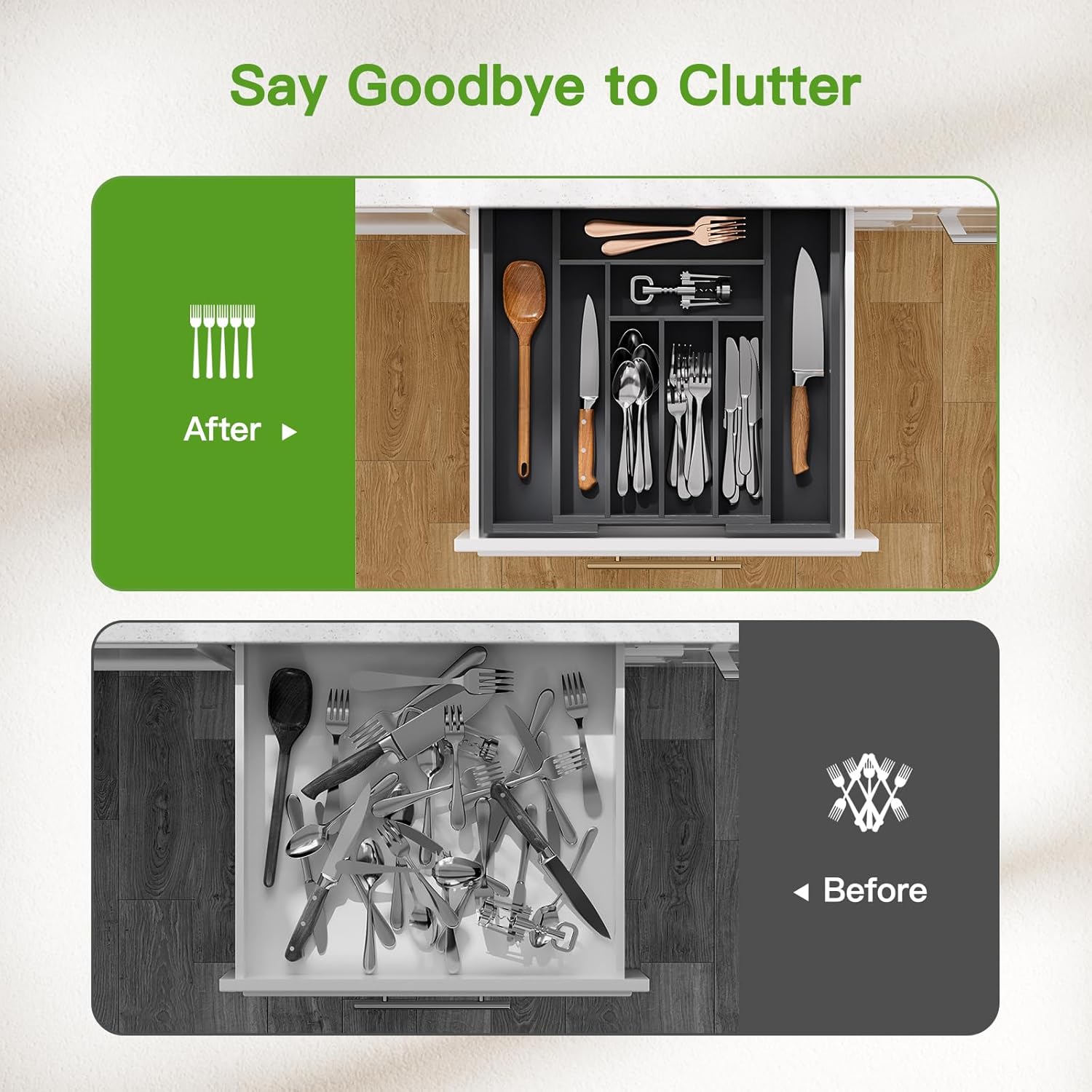 • Expandable and Adjustable Utensil Organizer: Designed with 6-8 compartments, the silverware organizer can save space while accommodating multiple items, which is expandable from 10.31 inches to 16.54 inches wide with smooth sliding.