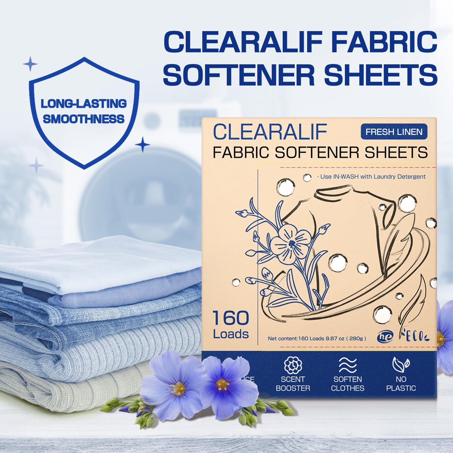 CLEARALIF laundry Fabric Softener Sheets, Fresh Linen Scent, 160 Loads, Eco Friendly, Great For Travel, Apartments, Dorms.