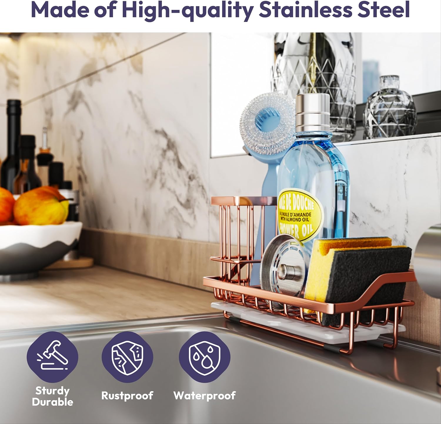 SWTYMIKI Sink Caddy Kitchen Sink Organizer with Detachable Brush Holder, Stainless Steel Sponge Holder with Removable Drip Tray Sponge Caddy for Kitchen Countertop, Rose Gold