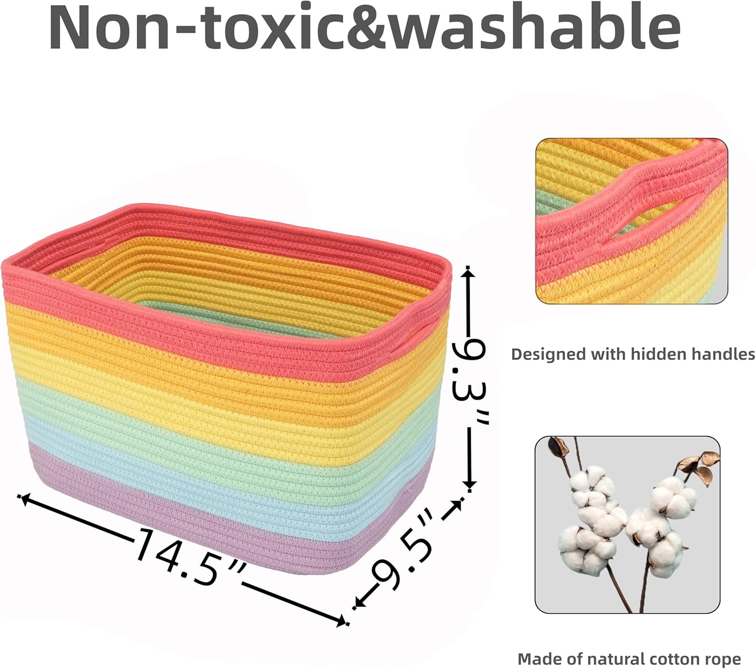 3-Pack Rainbow Storage Baskets 14.5X9.5X9.3“ – Woven Toy Organizer Bins for Kids, Baby Room, Nursery, and Classroom – Cute Square Rope Baskets for Shelves and Organization Rainbow