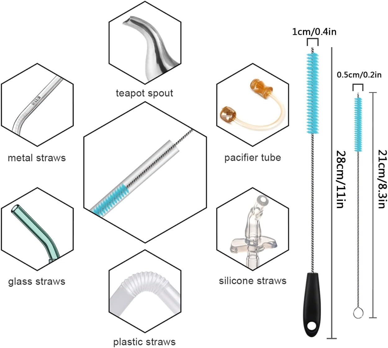 • The stainless steel long-handled water bottle brush features a removable design and one brush head that measures approximately 2 1/2 inches in diameter. The top of the brush handle has a keyhole-like slot into which the brush head can be inserted by sliding the bottom of the brush head into the slot and twisting the brush head to the left to lock it in place. The large straw brush is 10.8 inches/27.5 cm long for easy cleaning of sports water bottle thermos straws, and the small straw brush is 8 inches/20.5 cm long for cleaning and unclogging the microscopic holes in baby bottle straws to keep them clean, hygienic and environmentally friendly.