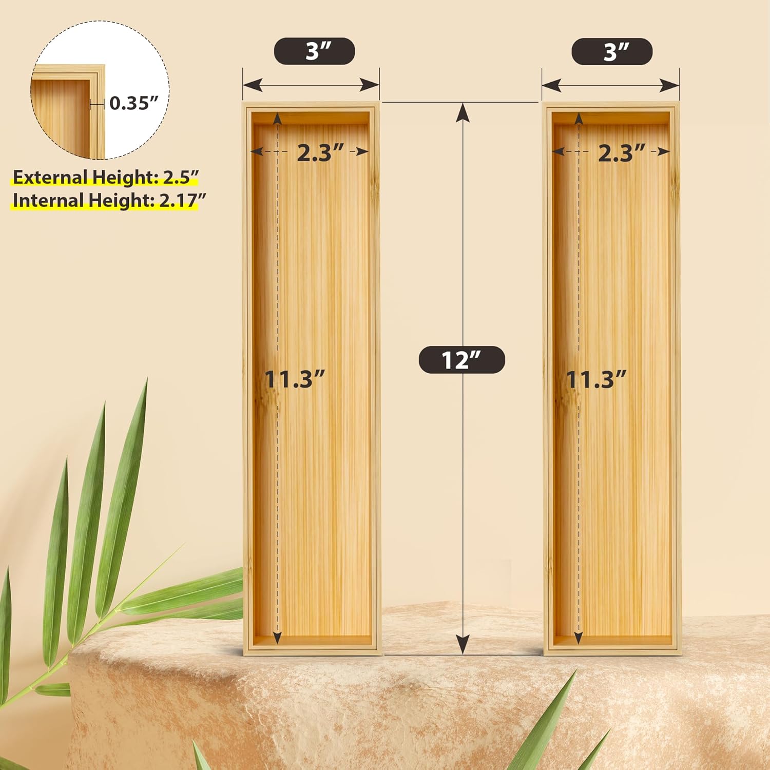 Kitchen Drawer Organizer Bins, Stackable Bamboo Deep Drawer Organizer for Silverware, Utensils, Cutlery, Flatware, Junk Drawer, Dresser, Bathroom, 12" x 3" x 2.5" (Set of 2)