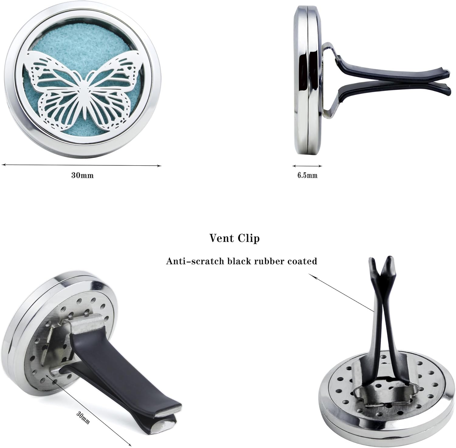 • 【Material 】high quality 316L stainless steel 30mm Car Diffuser Vent Clip, solid and smooth, anti-corrosion, easy to clean, we pair our diffuser car vent with reusable 10 color refill pads. Complete with a solid back and two magnets for a secure close, you’ll never have to worry about getting essential Oil all over your car.