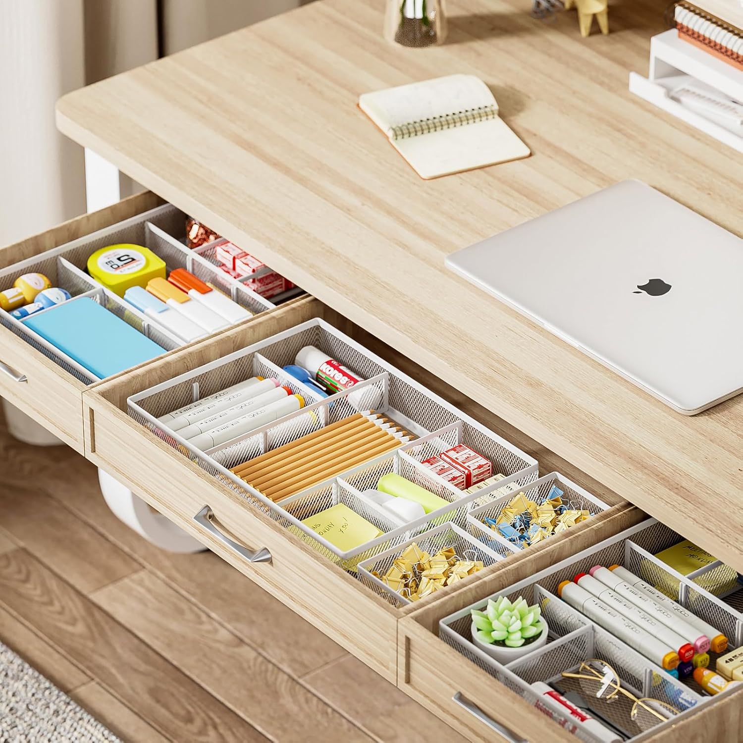 • 【Customizable Compartments Size】The 6 removable dividers can be combined in any size you need to fit different stationery such as pens, erasers, highlighters, notes, staplers, tapes, clips or other supplies.