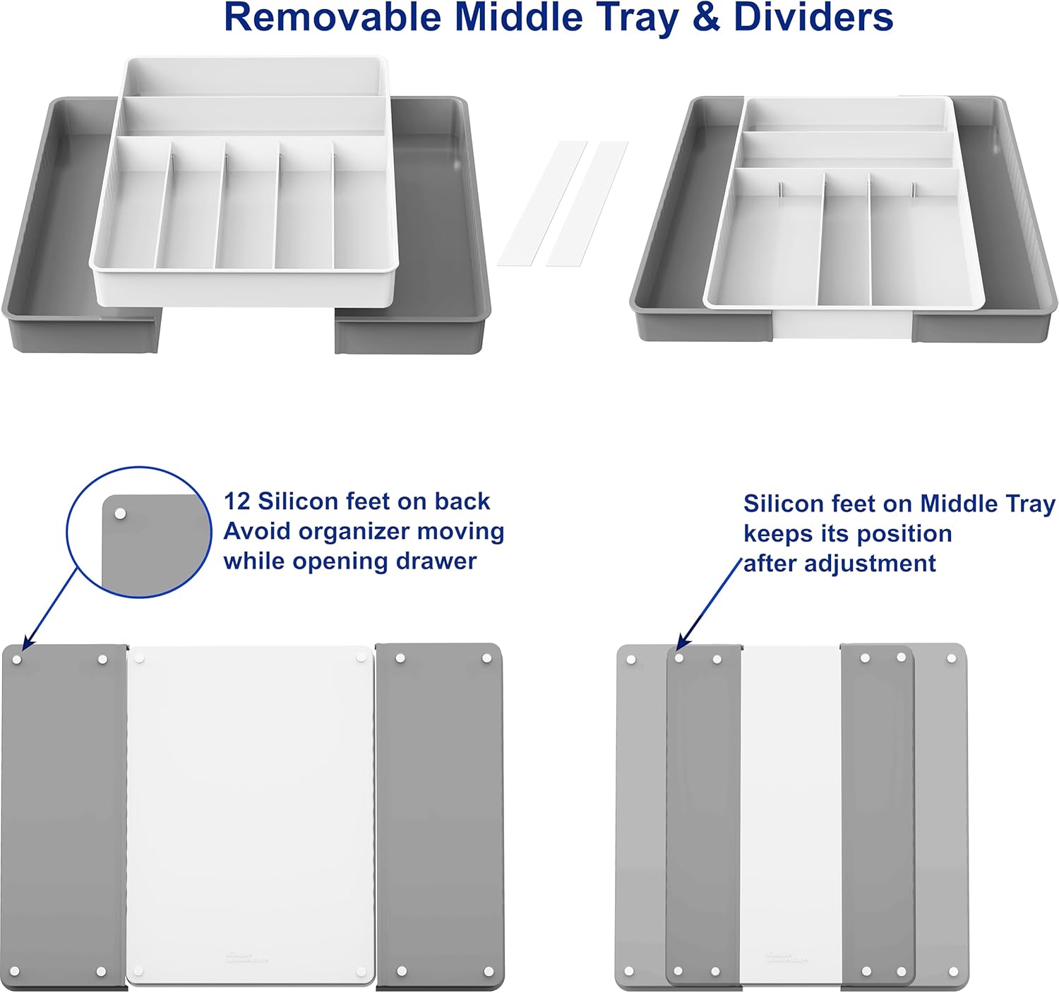 • Removable middle tray allows this organizer transform into 3 pieces. Thus it can be used in 3 different size of drawers