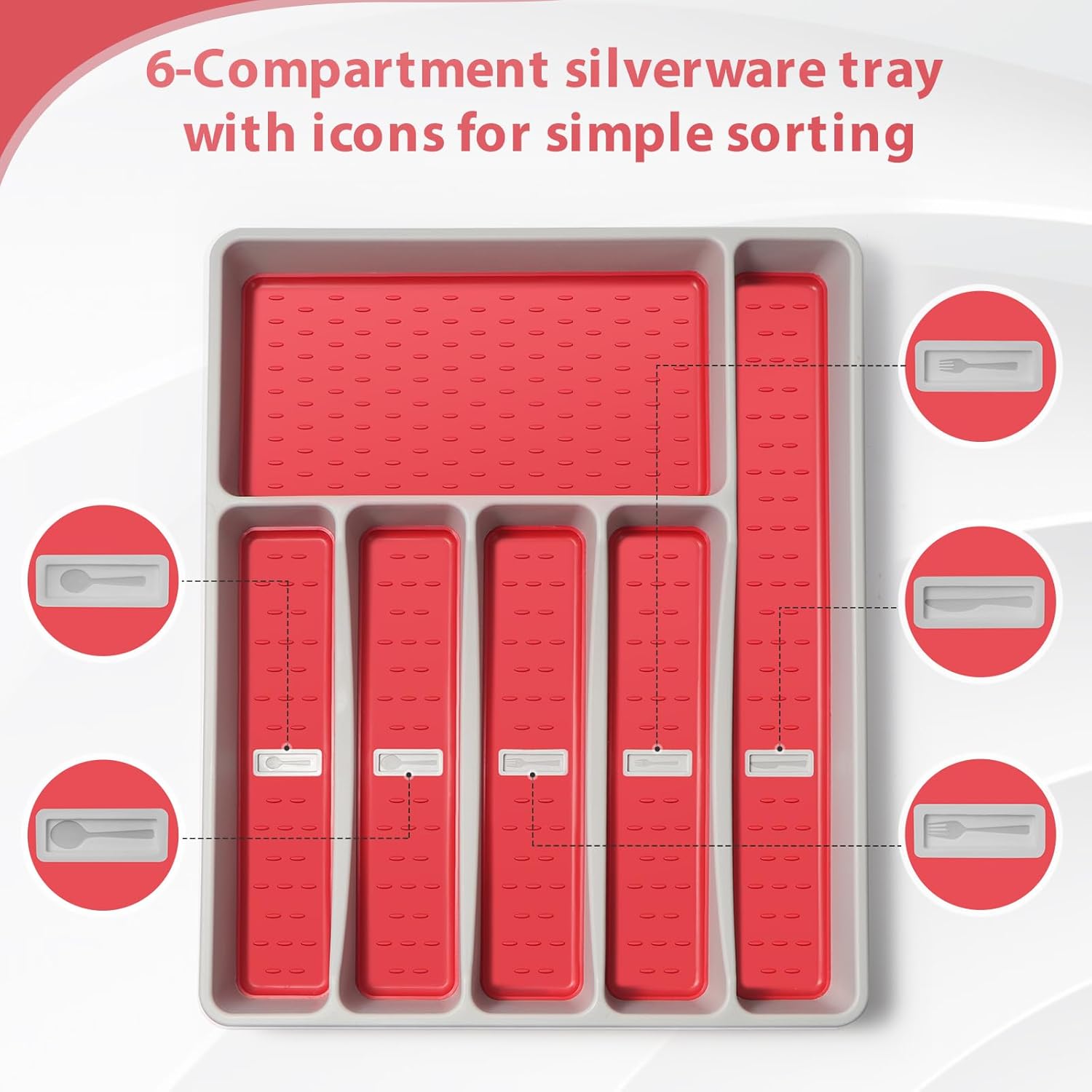 - 6-Compartment Flatware Organizer With Cutlery Icons:Still keeping your cutlery cluttered in your kitchen drawer?This cutlery tray with cutlery icons will really help you!It provides the perfect habitat for knives, forks and spoons and other kitchen necessities, and comes with icons to help you better store and sort,with this you will find that your kitchen drawers will be neat and organized.