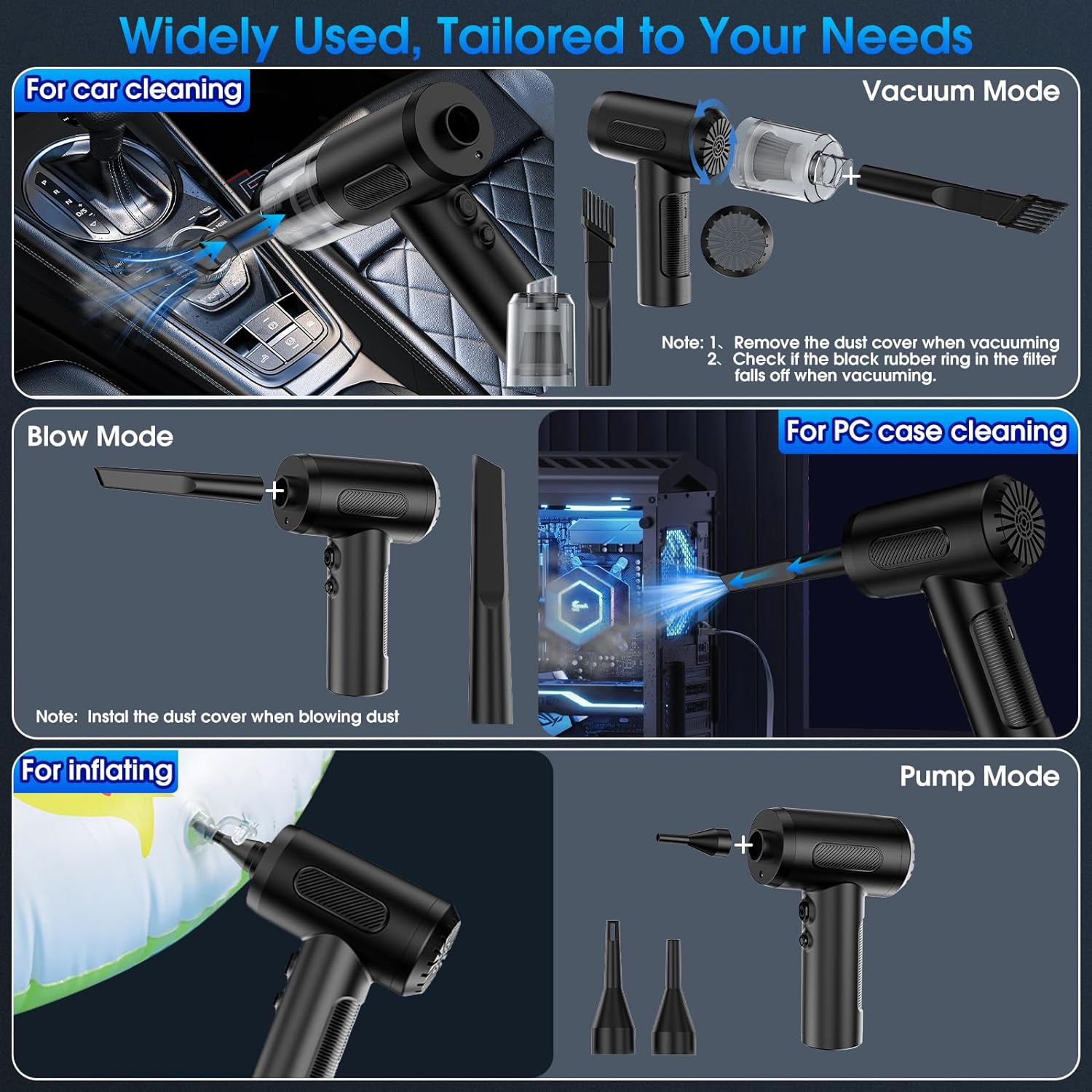 - 【Compressed Air Duster and Vacuum, Pump】Not only a compressed air duster, but also a handheld car vacuum for keyboard or cars, frames that is compact, lightweight and easy to use. Freely switch to compressed air duster or car vacuum cleaner mode according to your needs, easily removes dirt, debris, dust, pet hair, and deeply embedded dirt, also blow up swimming rings or blowing BBQ charcoal etc.