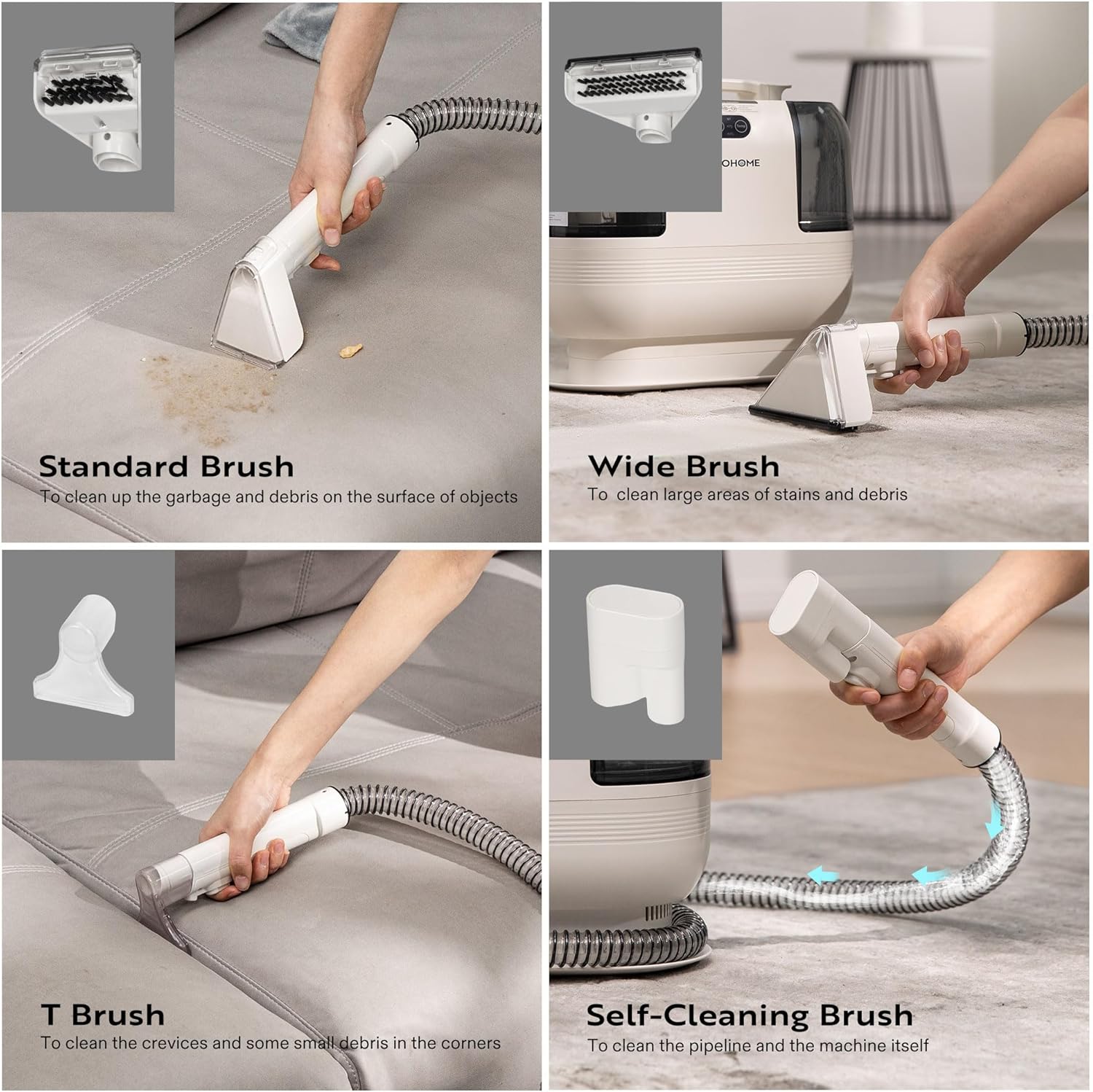 - HUMANIZED DESIGN - It comes with 4 detachable brush heads: standard, wide, T-type, and self-cleaning; The standard and wide brush heads are suitable for large areas, while the T-type brush head is designed for gaps; The high-quality brush heads ensure no damage to fabric surfaces; The removable hose allows for easy replacement; With noise reduction technology, it operates at a noise level below 80 dB, making it ideal for families with babies and pets