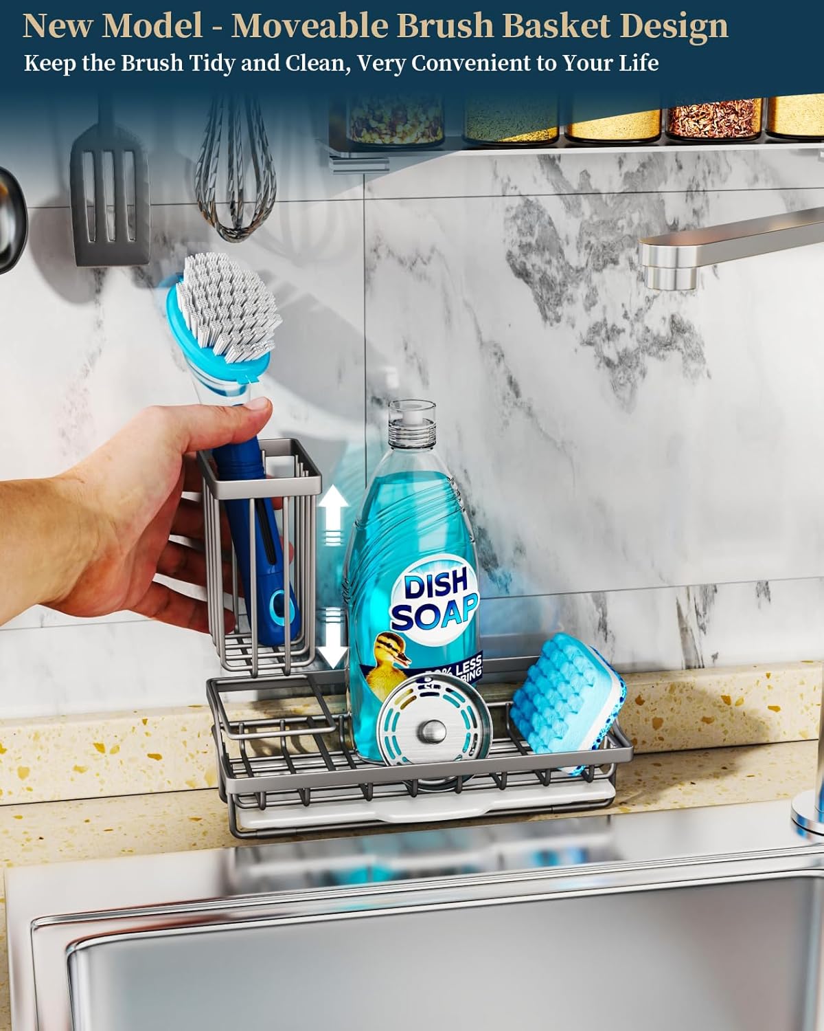- [Counters Tidier - Sponges Drier]: This sponge holder is perfect to organize your sponges, dish soap, brush in one place, make brush upright help them dry quicker. Kitchen sink caddy size is 8.26 * 3.54 * 4.7 in, an excellent helper for sink organization