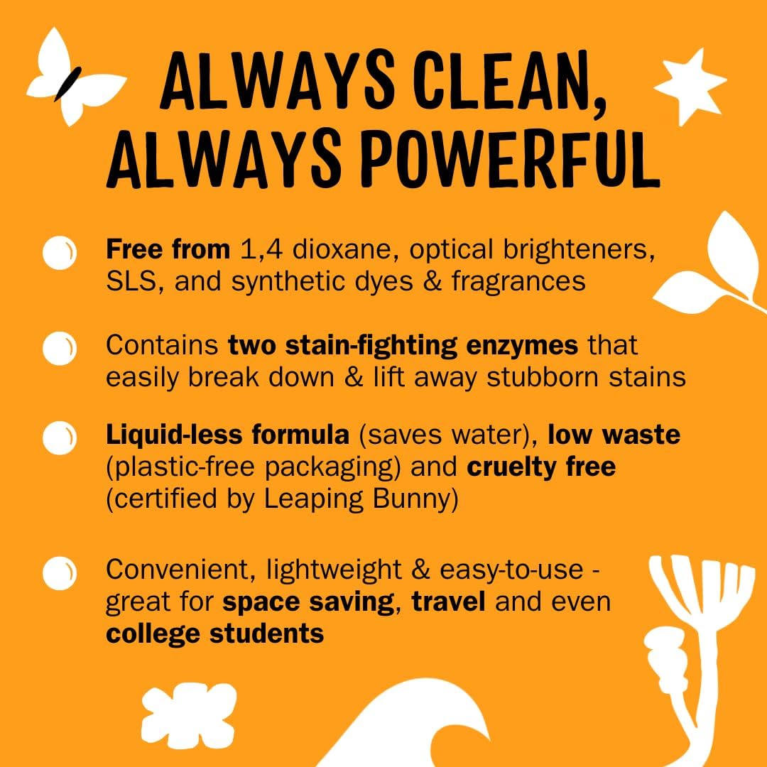 • Liquid-less formula (saves water), low waste (plastic-free packaging) and cruelty free (certified by Leaping Bunny)