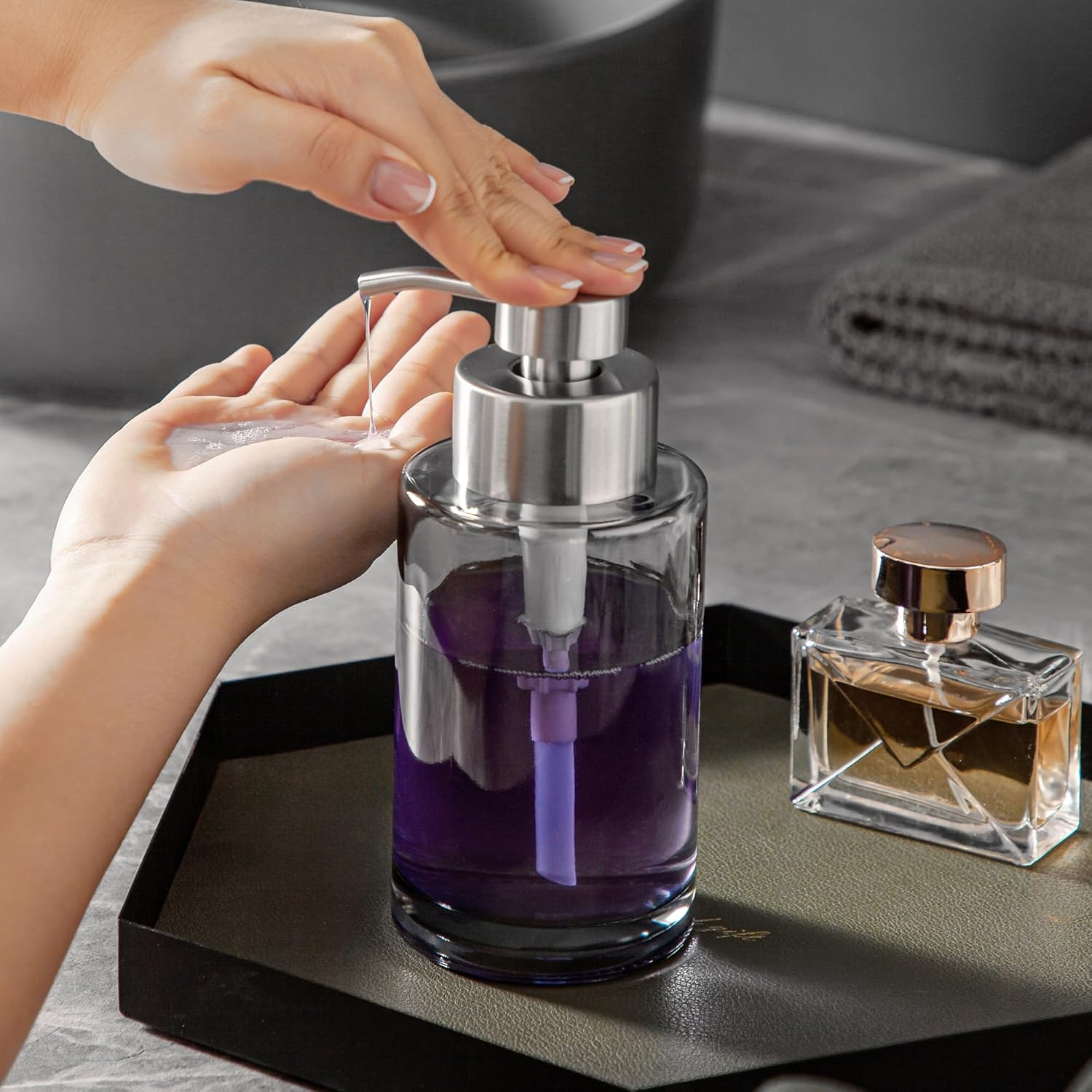 Enra Thick Glass Soap Dispenser with Stainless Steel Pump, 12oz Bathroom & Kitchen (Silver)