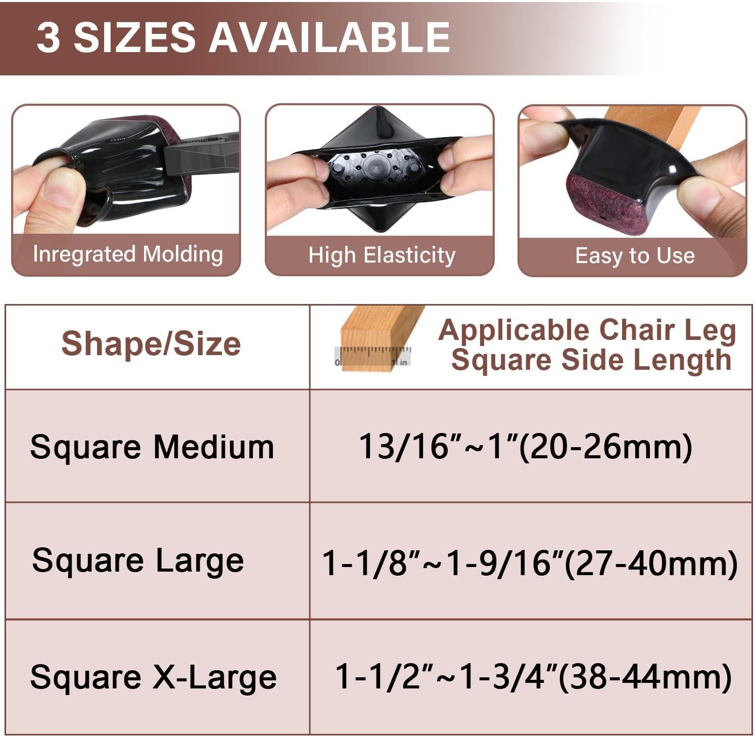 • [Stretchable fit a range of sizes]-Our chair leg floor protector is narrow at the top and wide at the bottom to adapt to various sizes. Fit square leg side length 1-1/8" to 1-9/16" (27-40mm).