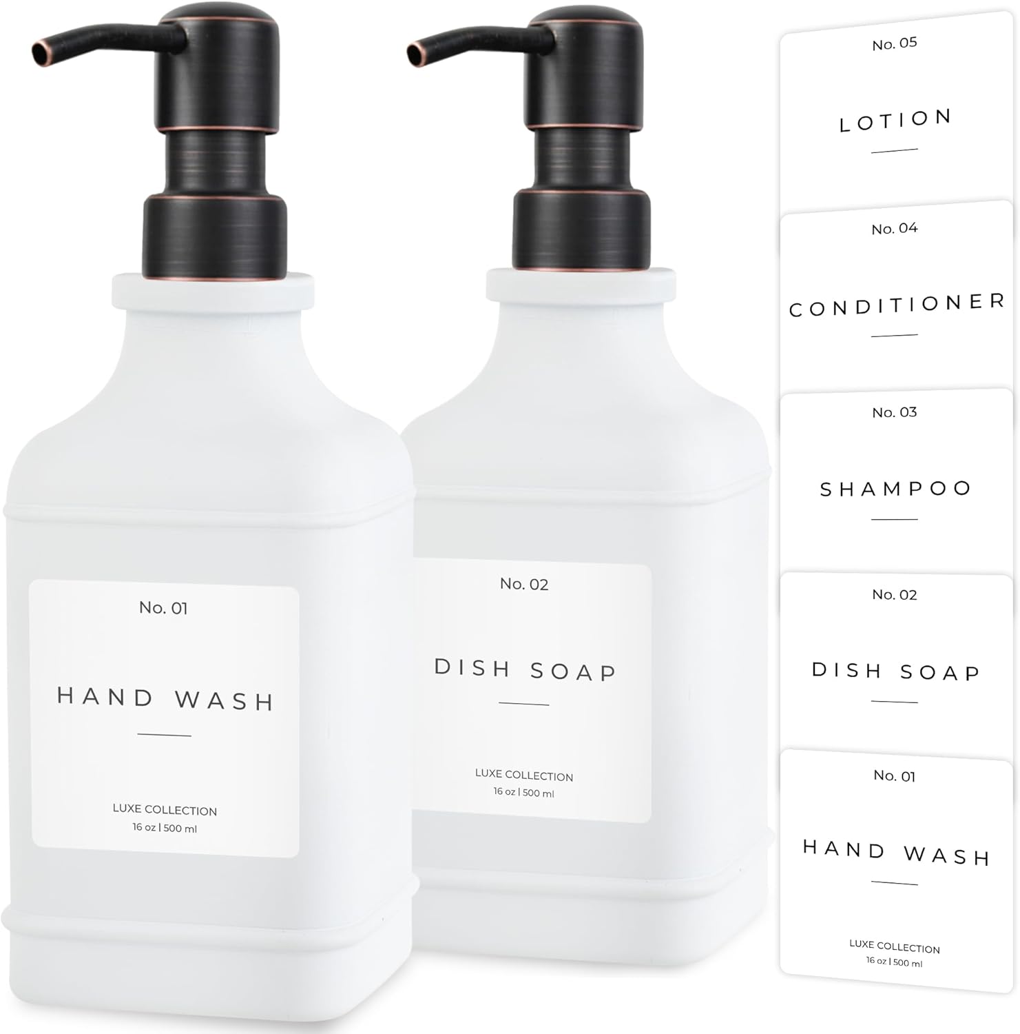 - ✅ 5 WATERPROOF LABELS: Now with 5 stickers, it's your choice to use the Kitchen Soap Dispenser Set with Dish Soap for hand soap, dish wash, lotion, conditioner, or shampoo. To clean the lotion dispenser set for the bathroom and kitchen sink soap dispenser set, just run the bottle under water and watch any residue simply wash off. With our exclusive no-leak pump, the bottle enables you to put out a good amount of soap with a single pump.