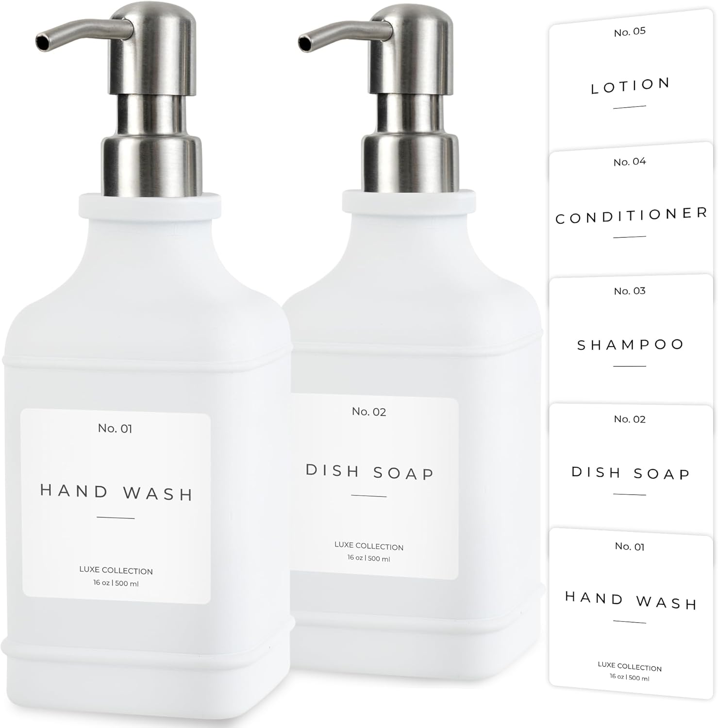 - ✅ 5 WATERPROOF LABELS: Now with 5 stickers, it's your choice to use the Kitchen Soap Dispenser Set with Dish Soap for hand soap, dish wash, lotion, conditioner, or shampoo. To clean the lotion dispenser set for the bathroom and kitchen sink soap dispenser set, just run the bottle under water and watch any residue simply wash off. With our exclusive no-leak pump, the bottle enables you to put out a good amount of soap with a single pump.