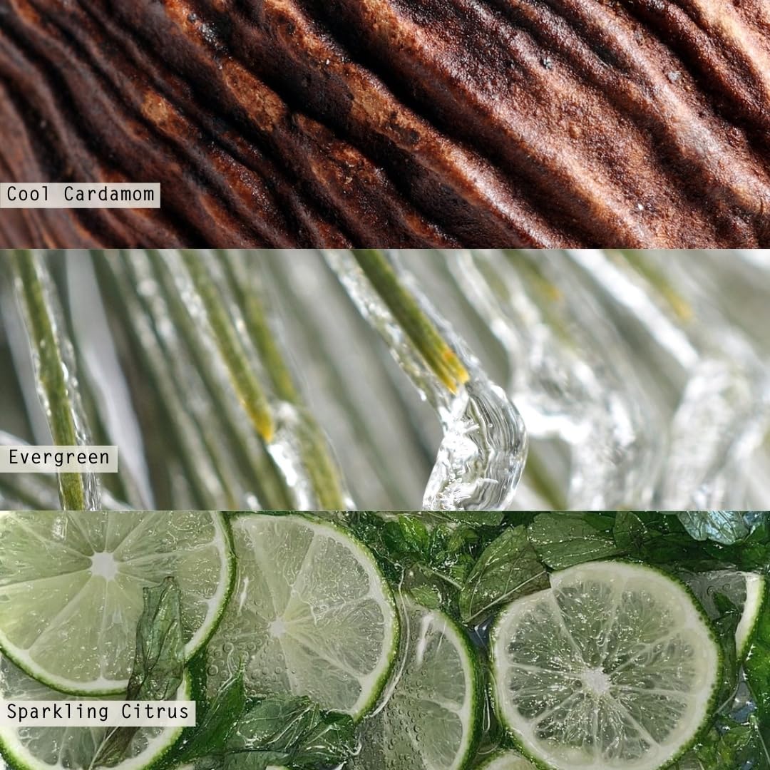 • This scent is grounded in cool cardamom with a heart of evergreen kissed with sparkling citrus