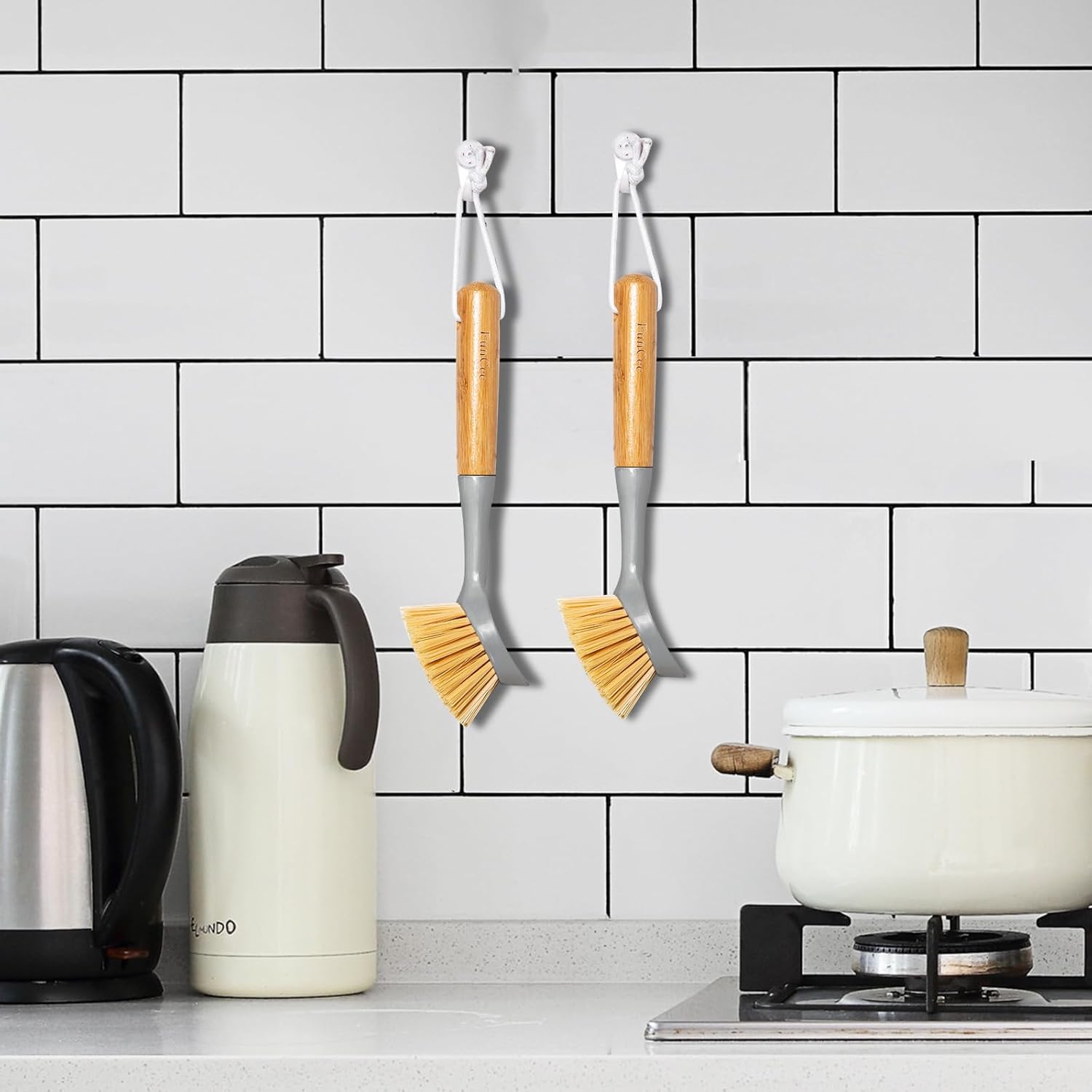 • [Eco-Friendly] This kitchen brush built with sturdy eco-friendly and comfortable natural bamboo handle, non-scratch and odorless bristles. The Kitchen brush with scraper scrub brush head, can easily removes stuck-on food, and dish scrubber’s handle has hanging loop for hanging to drying & storage.
