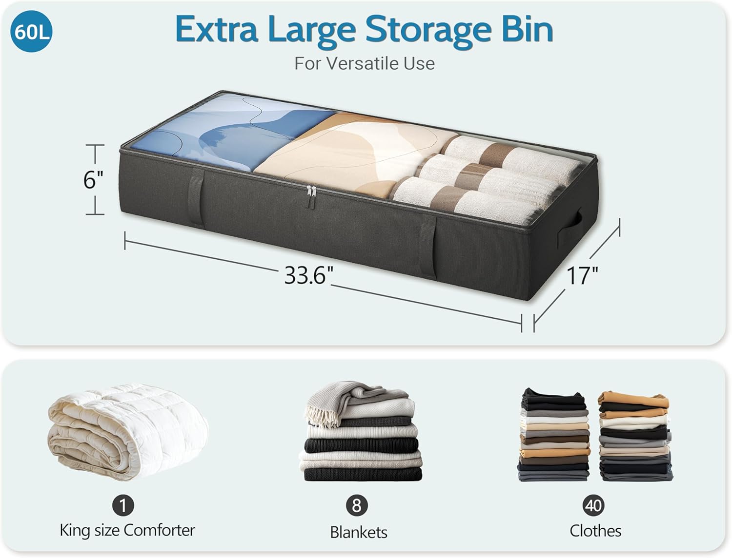 • 60L Large Capacity Storage Bin - This underbed storage has a capacity of 60 liters, 33.7"L x 17.1"W x 6"H, so you'll have enough space to store your favorite clothes, sheets, blankets, toys, CDs, books, and more. You won't be disappointed about this under bed storage container!