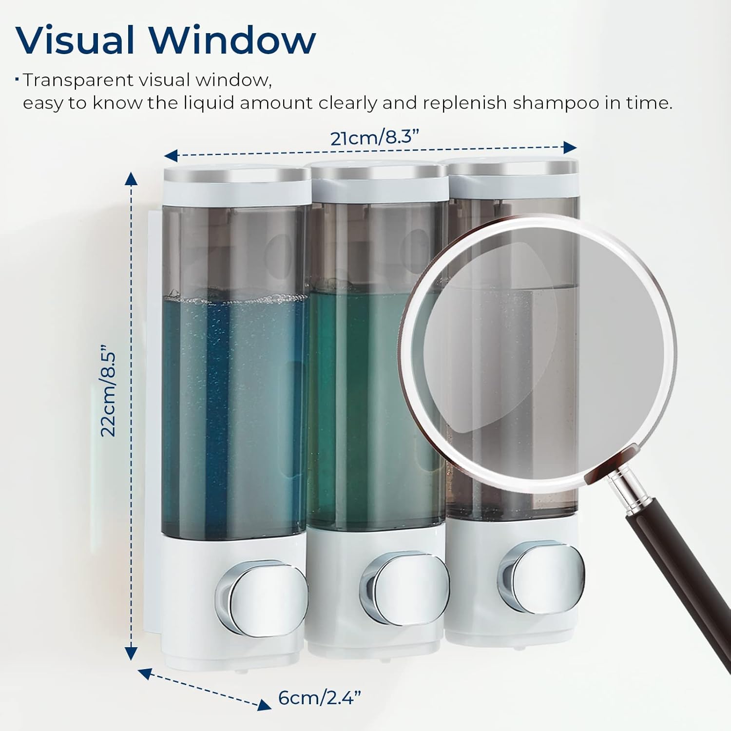 • LARGE CAPACITY-Shower soap dispenser holds 300 ML/12.85 US (each Chamber), easy to fill with soap liquid; Transparent visual window,easy to know the liquid amount clearly and replenish shampoo in time; Super large coating button and manual pump can operate with press lightly,moderate liquid once pump output, no leakage and waste.