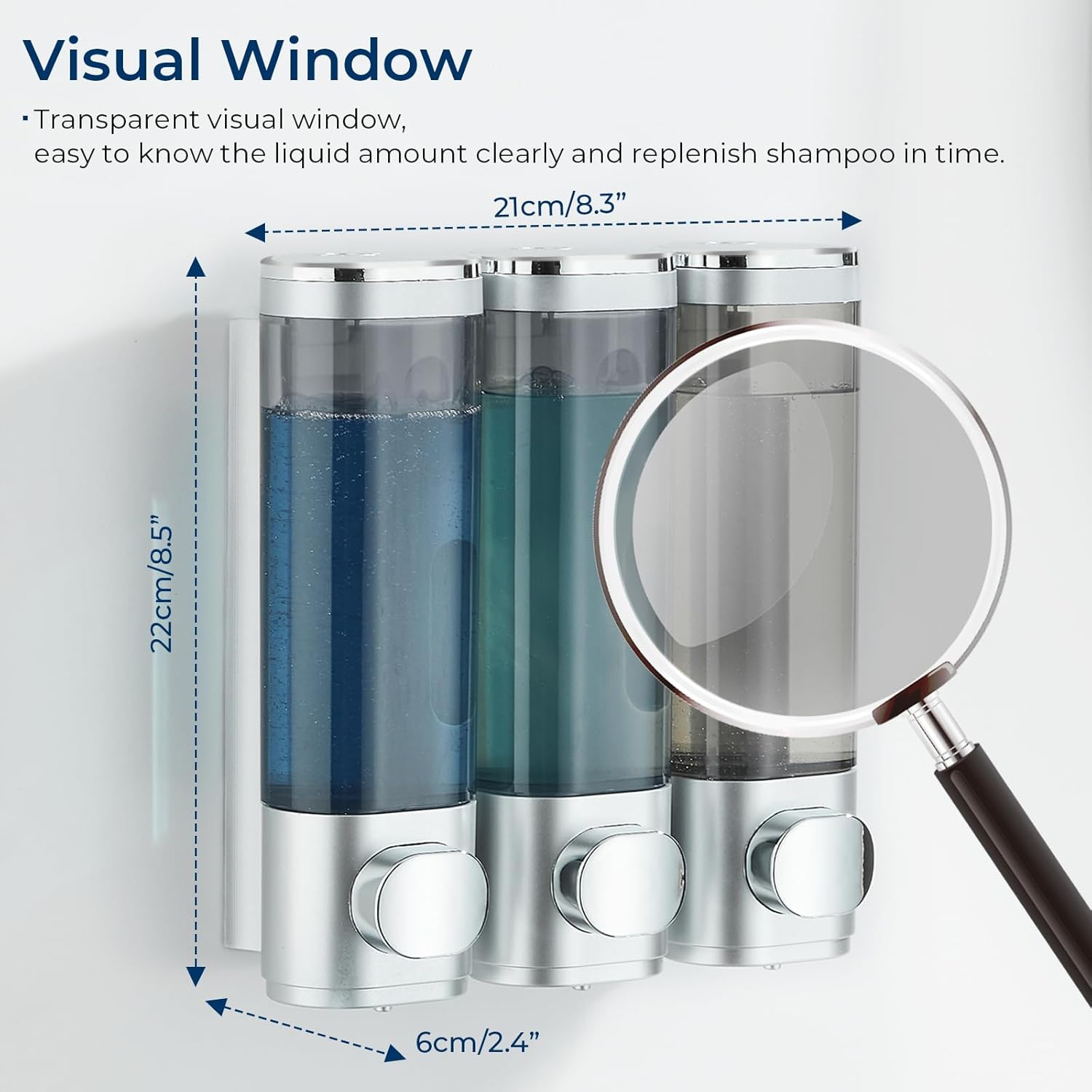 - 🔮LARGE CAPACITY-Shower soap dispenser holds 300 ML/12.85 US (each Chamber), easy to fill with soap liquid; Transparent visual window,easy to know the liquid amount clearly and replenish shampoo in time; Super large coating button and manual pump can operate with press lightly,moderate liquid once pump output, no leakage and waste.