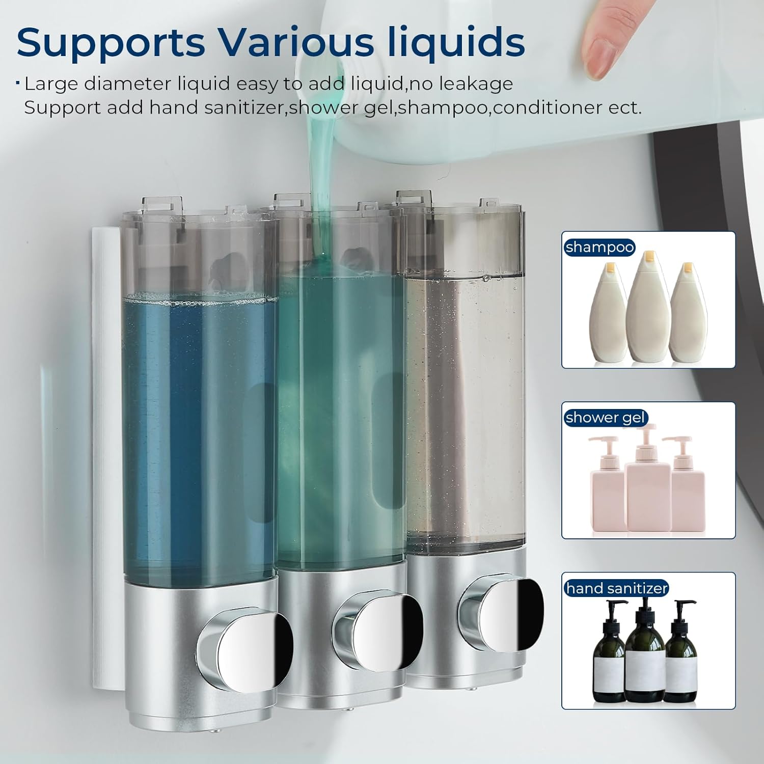 - 🔮WIDELY USED- Shower dispenser 3 chamber no drill is the storage and cleaning for bathrooms, kitchen,schools,hospitals or commercial hotels, making your messy countertops instantly organized and tidy, improving bathroom space; it is effective alternatives to messy bottles ,easy to scrub and clean. It will make your life more convenient and interesting.