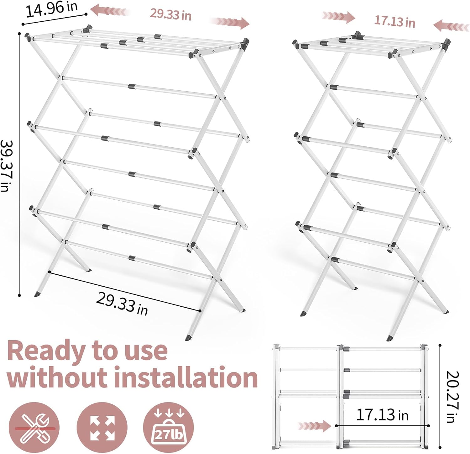 • Instant Use: With no tools required, this clothing drying rack can be set up quickly and easily straight out of the box. Simply pull up the rack and ensure it is locked in place. For more drying space, expand the rack before pulling it up.