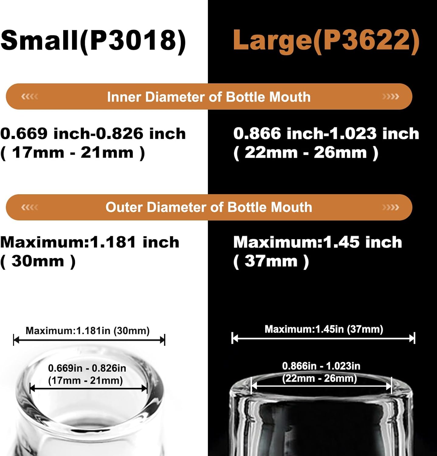 • Fits Most Bottles: Two models, covering 90% of common glass bottle mouths, fit up to Inner 0.669 inch-0.826 inch (17 mm-21 mm )and outer diameter maximum 1.181 inch (30 mm) bottle necks