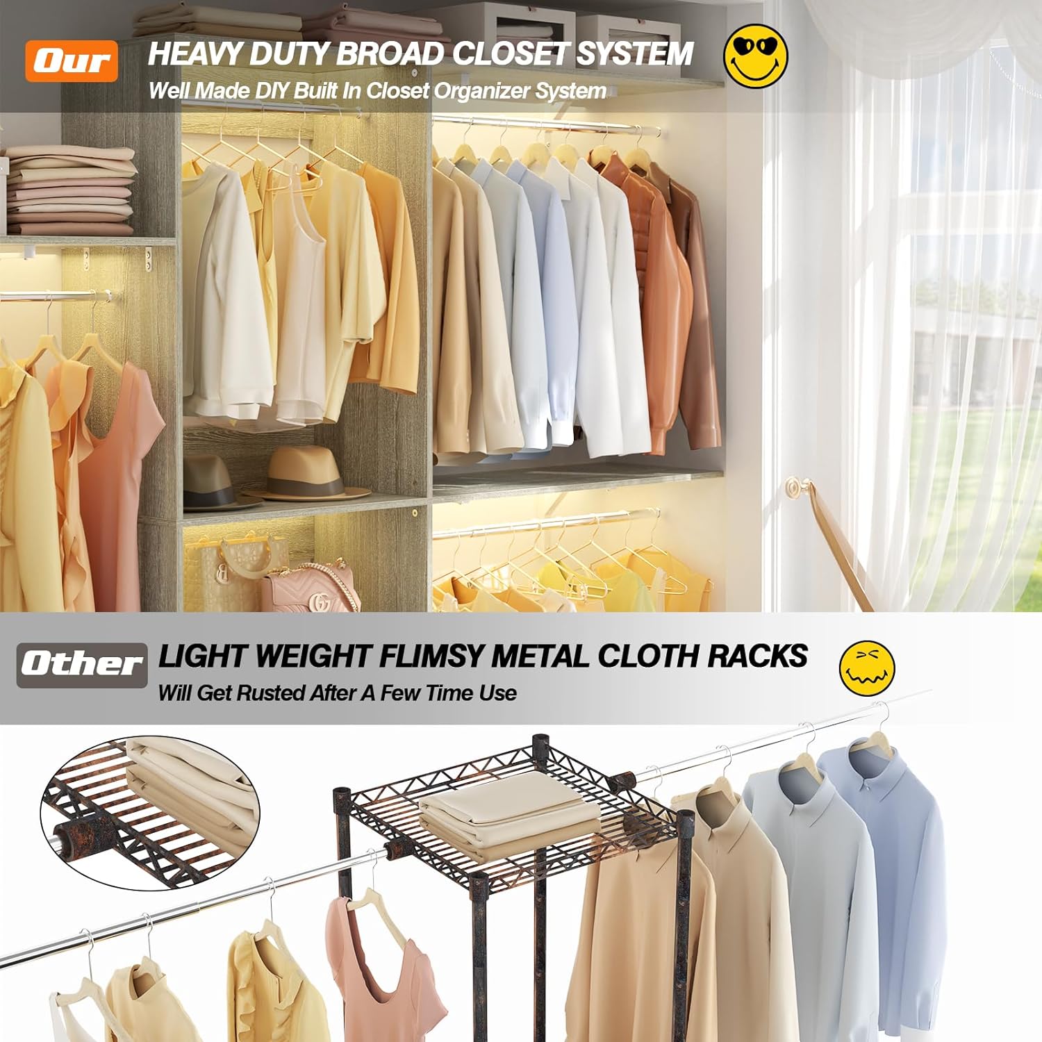 - 【All in One Sturdy Clothing Garment Rack】This 8ft wall-mounted clothing garment rack is a perfect home organization system for closet spaces to store shirts, pants, jackets, sweaters, shoes, decor or other items. It is made of heavy-duty wood board, not the shaking metal frame, the weight capacity can hold up to 1000+ lbs.