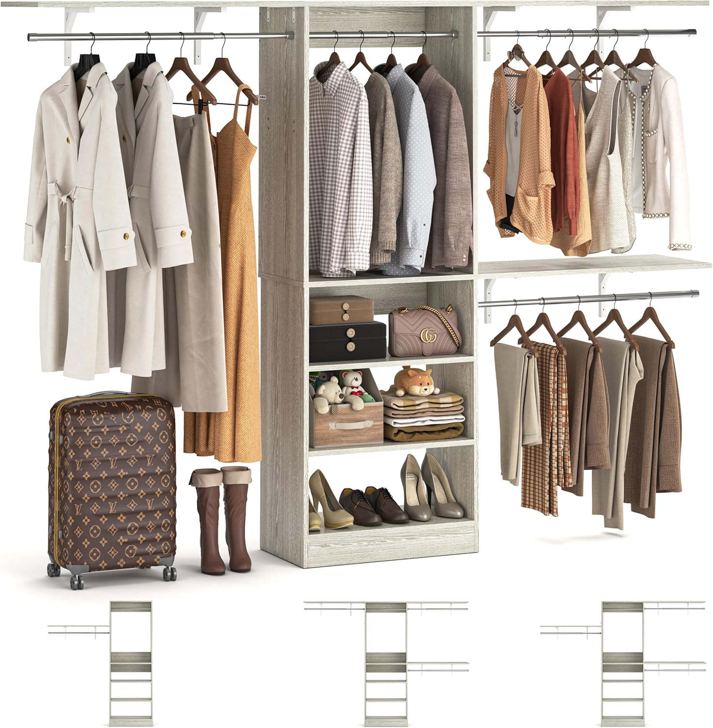 8FT Closet System with Shelves, 96'' Closet Organizer System with 3 Hanging Rods, Wall Mount Bedroom Wardrobe Walk-in Closet, Adjustable Cloth Garment Rack from 5 to 8FT(Cut to Fit), White Oak