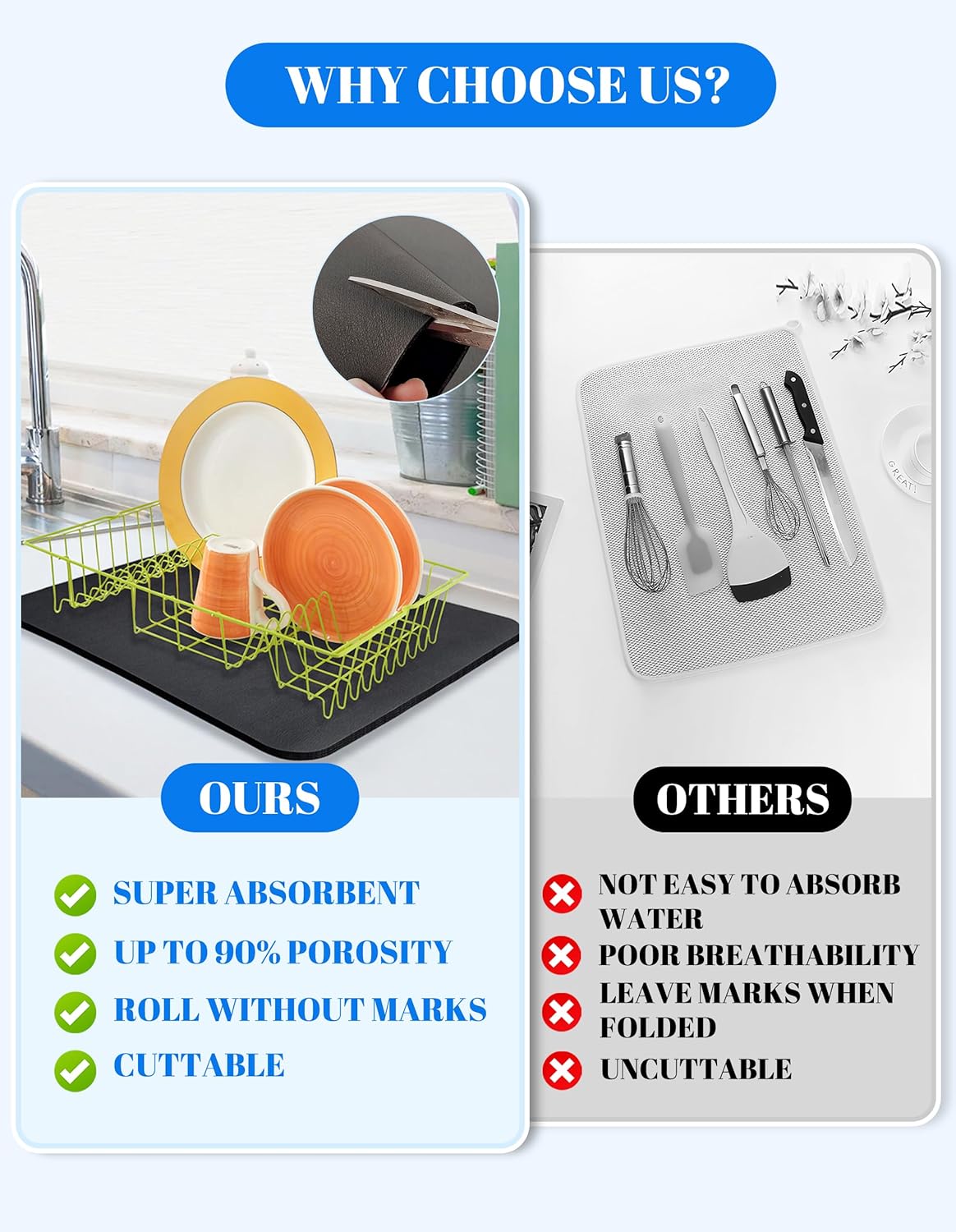 • SUPER ABSORBENT: The microfiber tableware dish drying mat is made of high-absorbent nanomaterials. Special PU surface hide coffee stains, milk stains and any other dark messy stains well. In addition, the drying mat is thick enough to better protect countertops, tableware, and glassware from damage and contamination.