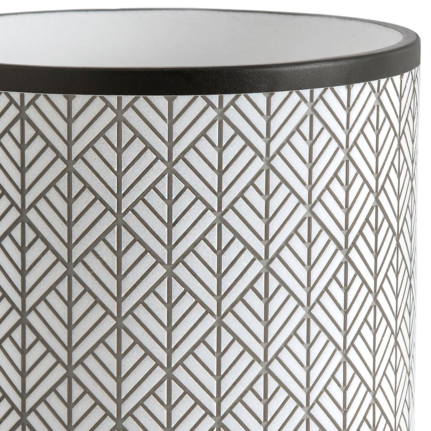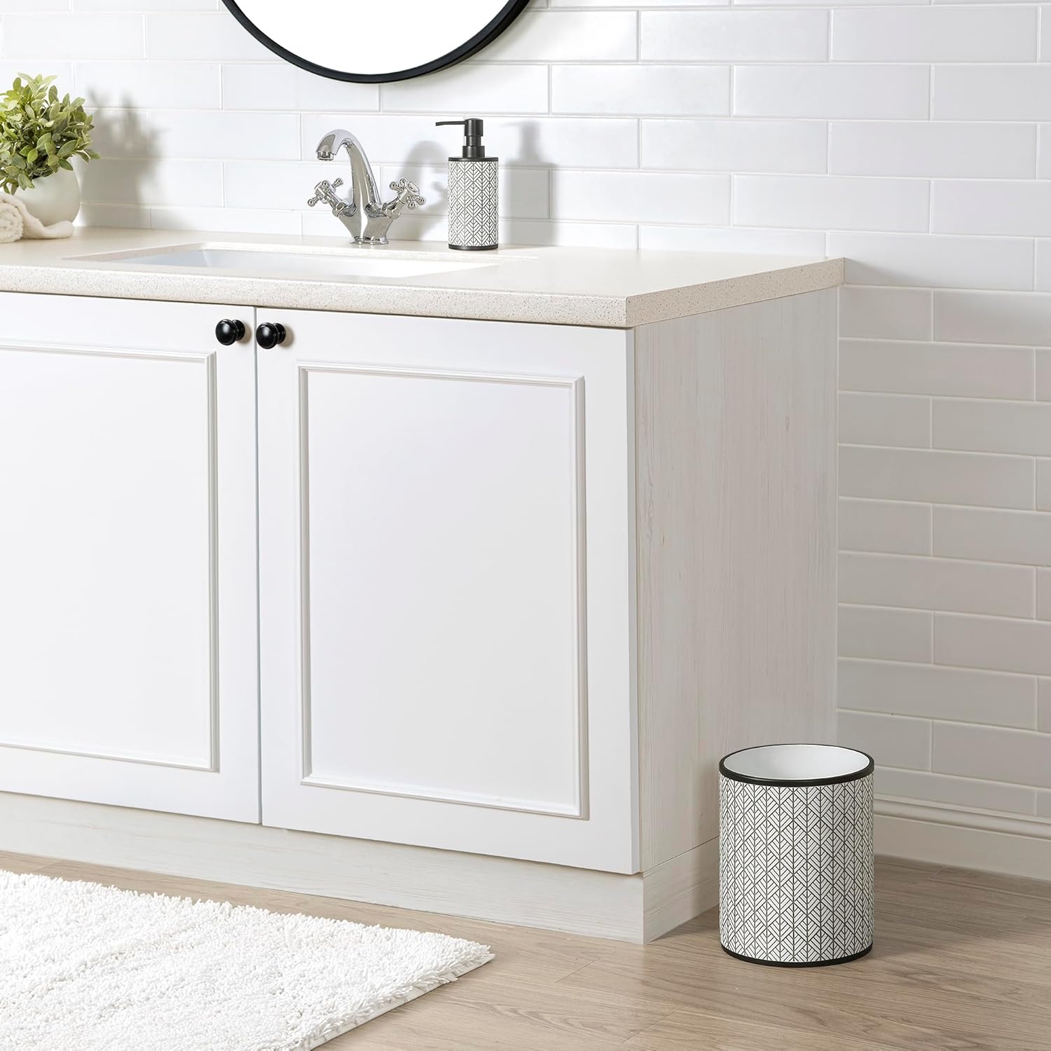 • Updated and sleek debossed liner geometric designed wastebasket in charcoal and white with black trim, offers sophisticated style to your bathroom