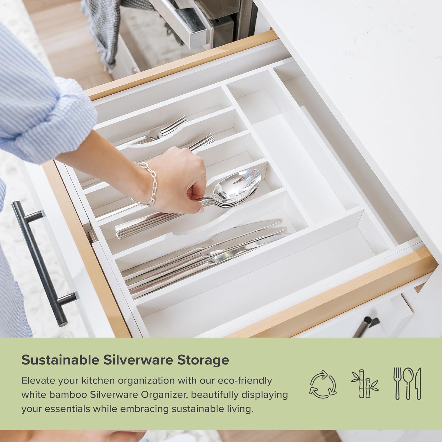 - MAXIMIZE YOUR DRAWER’S STORAGE CAPACITY: This 10-compartment (8 fixed + 2 adjustable) white organizer measures 17.4” long x 2.7” tall and expands from 14.5” to 25” wide (and any width in between). Most other bamboo organizers expand to 22” wide and are only 2” tall. It’s amazing how much storage capacity an extra 0.7” in height adds when filling your organizer full of flatware and utensils!