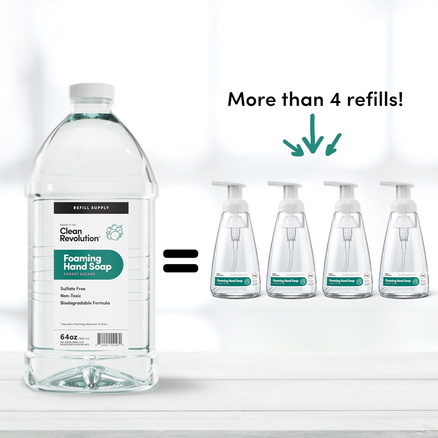 • REFILL & REUSE: Our Refill Supply container delivers exceptional value with 128 ounces of ready to use liquid foam soap designed to be used with Clean Revolution Refillable Foaming Hand Soap dispenser. This gallon jug has more than 8 refills, eliminating the need for individual single-use bottles and creating less plastic waste. Foaming Hand Soap dispenser sold separately.