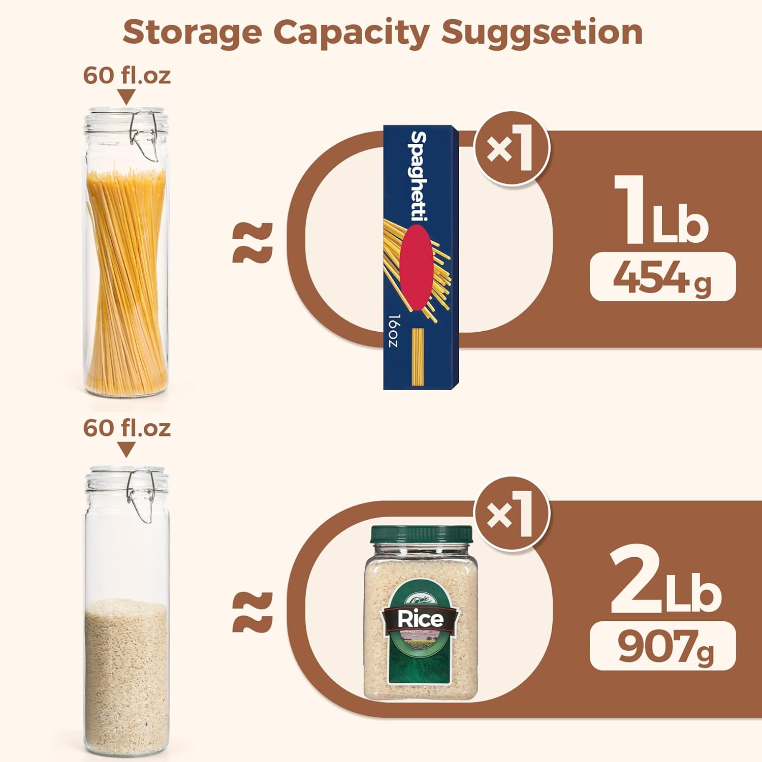• Airtight Spaghetti Container: The Spaghetti jar is made of food-graded glass; Each kitchen canisters for countertop is well sealed, equipped with a silicone gasket and a stainless iron locking clamp to make sure your food stay clean and fresh in storage