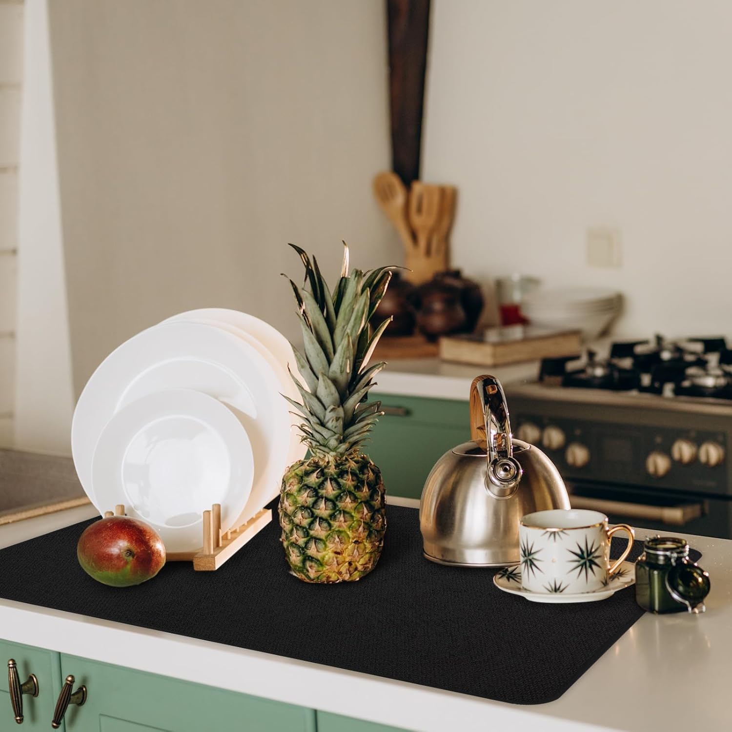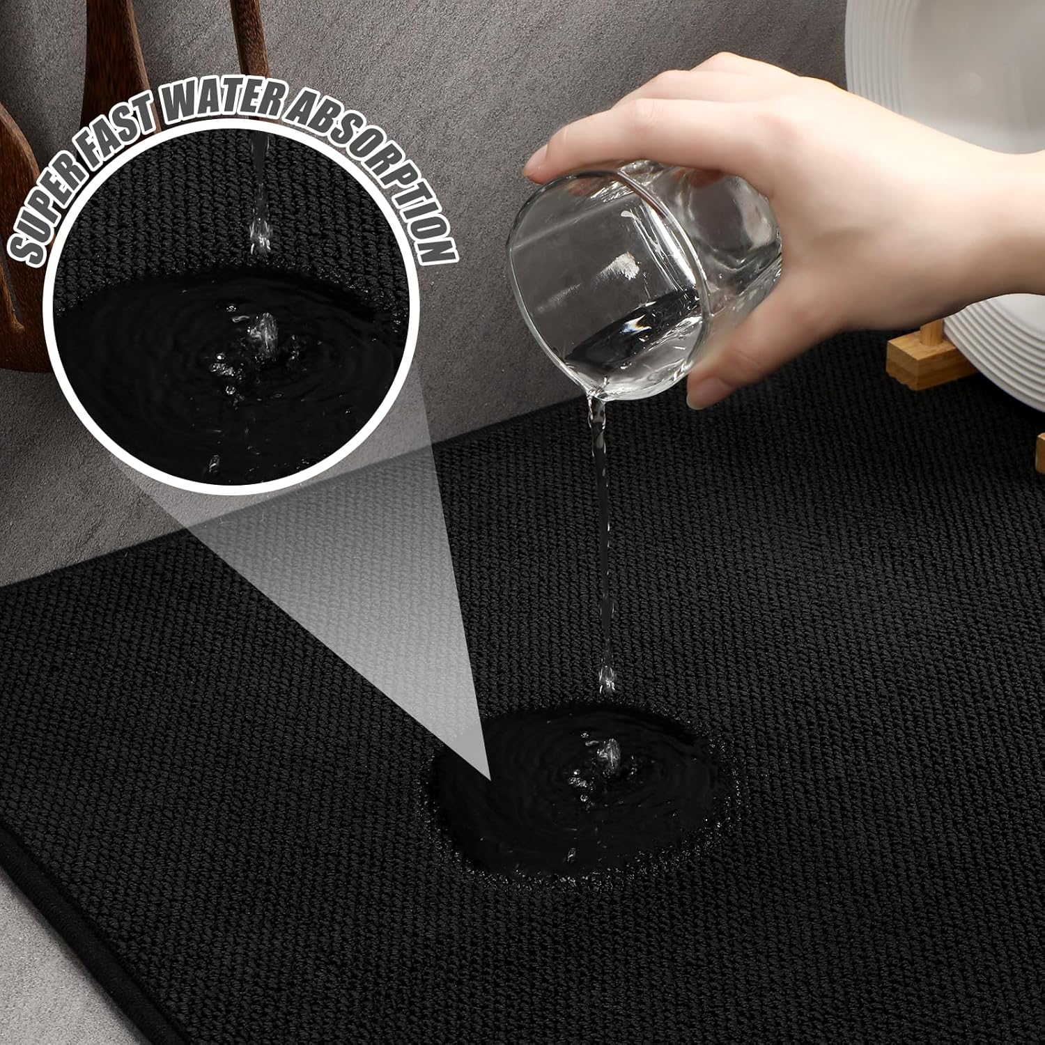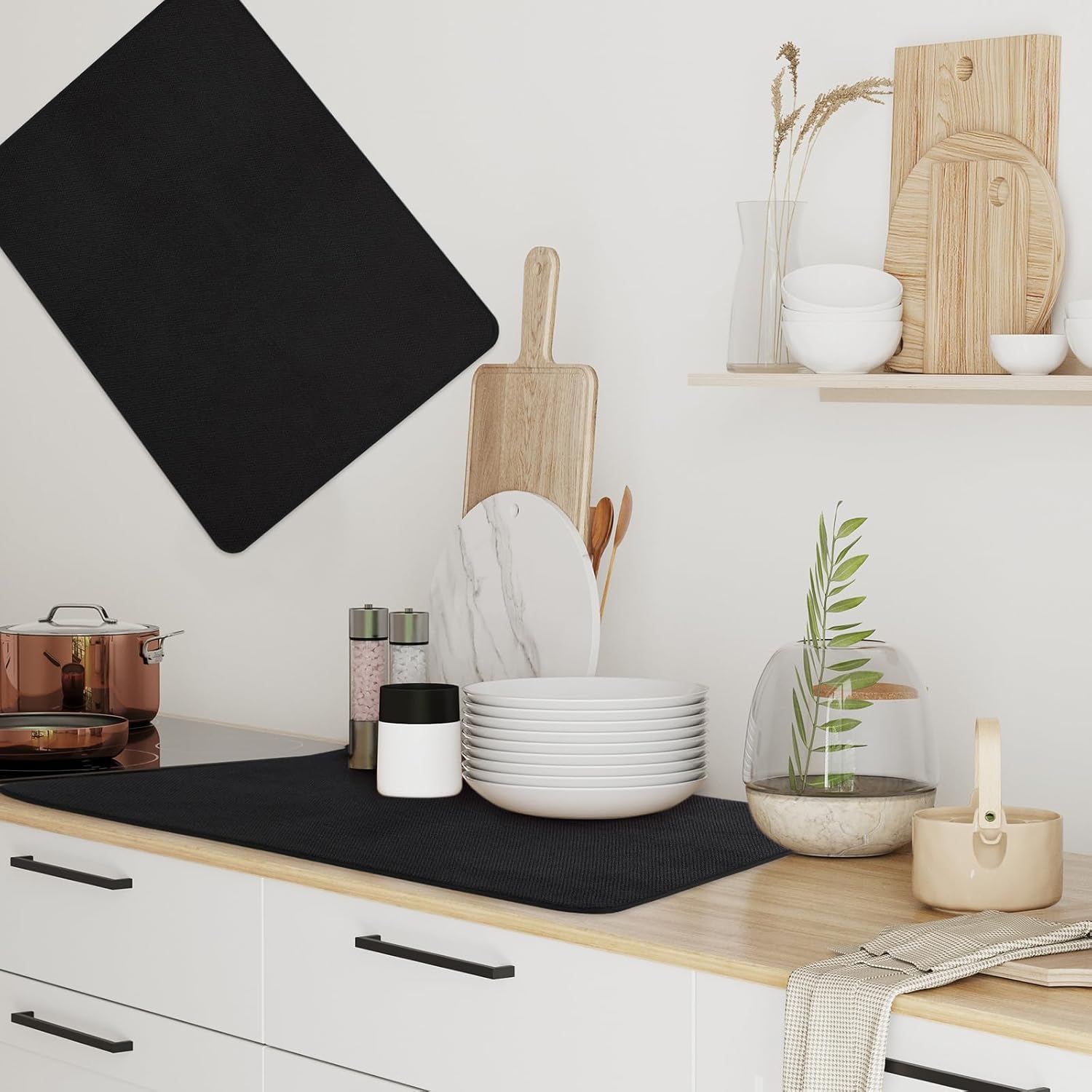 • Reliable Material and Attractive Design: get the ideal balance of functionality and style with our kitchen drying mats for dishes; Made from microfiber, these mats exhibit impressive water absorbent property, ensuring a dry, clean countertop; Their pleasing black color will effortlessly blend with most kitchen interior, enhancing its aesthetics