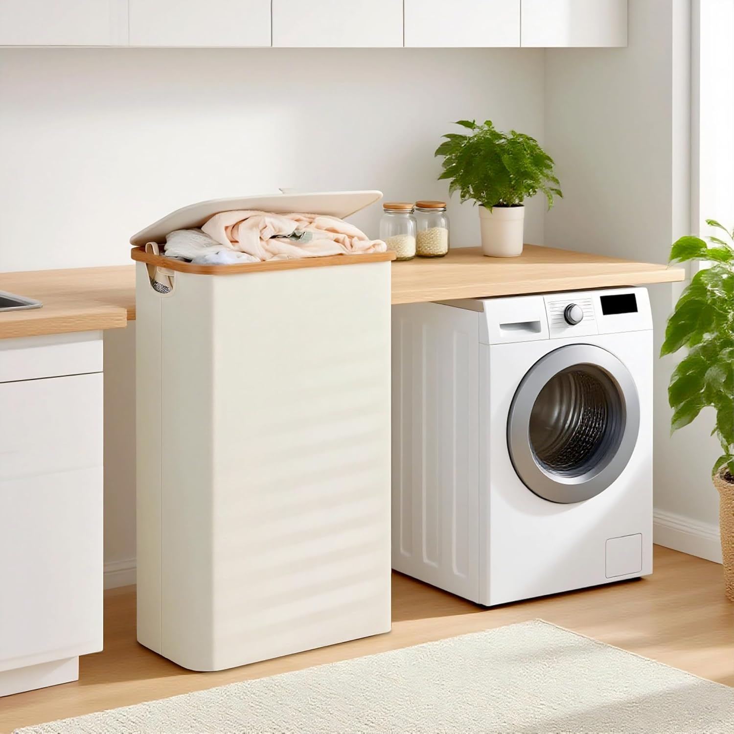 efluky Laundry Basket with Lid and Removable Bag, 100L Tall Laundry Hamper with Bamboo Handles, Aesthetic Dirty Clothes Bin for Laundry Room, Bathroom, Bedroom and Dorm, Beige