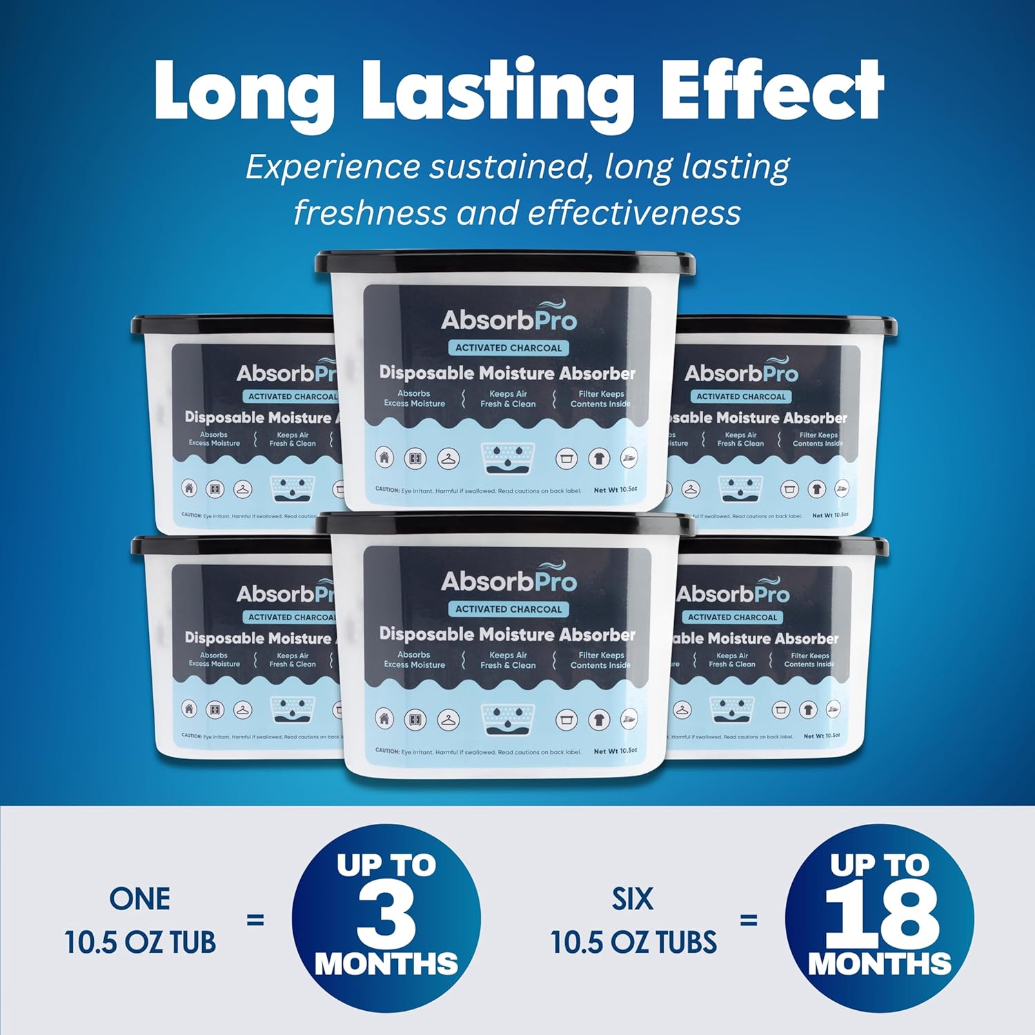 Moisture Absorber Tub with Activated Charcoal - 6-Pack - 10.5 oz Disposable Odor Eliminator Box & Dehumidifier for Garage, Home, Kitchen, Bedroom, Bathroom, Closet, Cars, and Boats