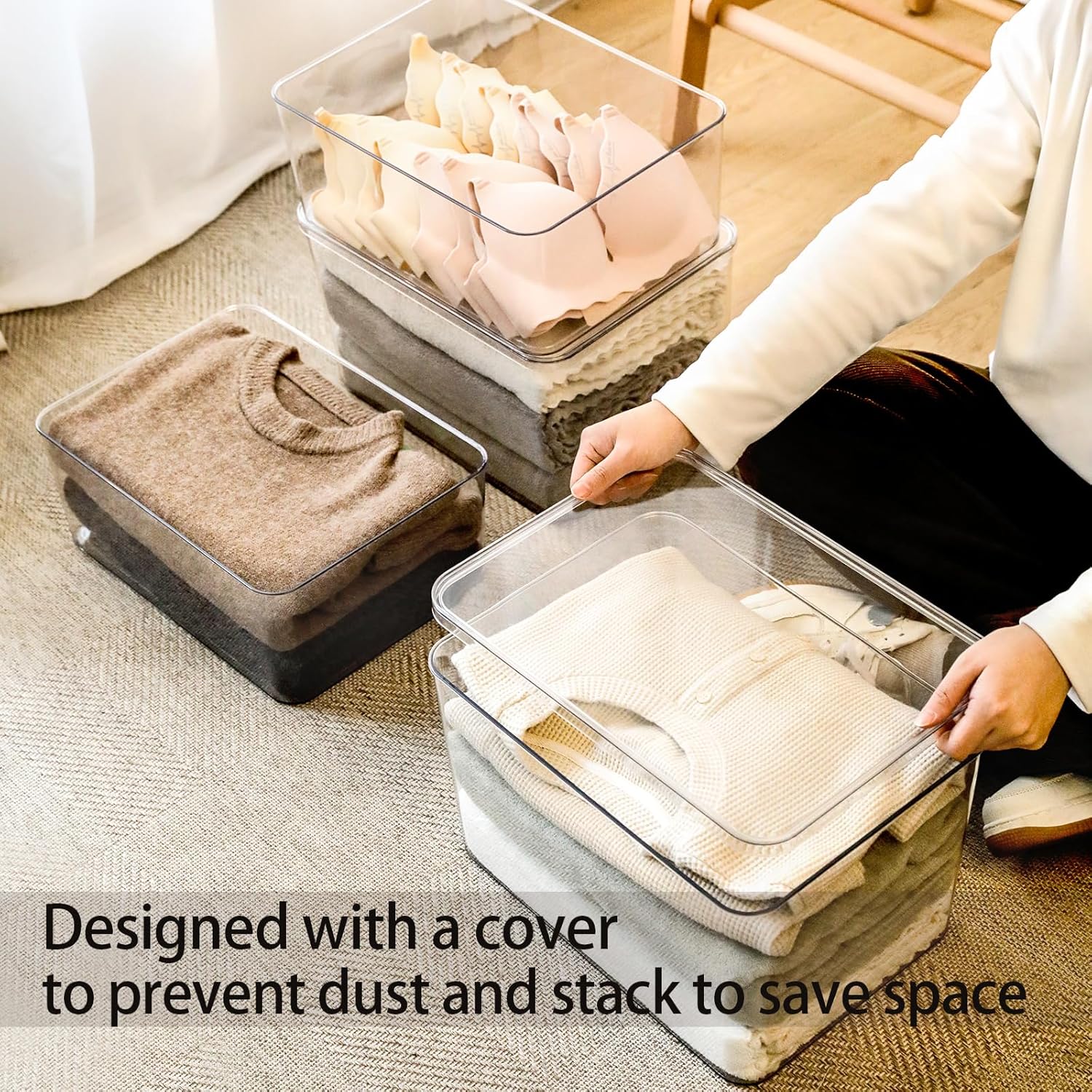 • 2. The transparent box can clearly see what is inside and find what you want at a glance. It is very suitable for storing clothes, food, shoes, toys, books, scarves, etc