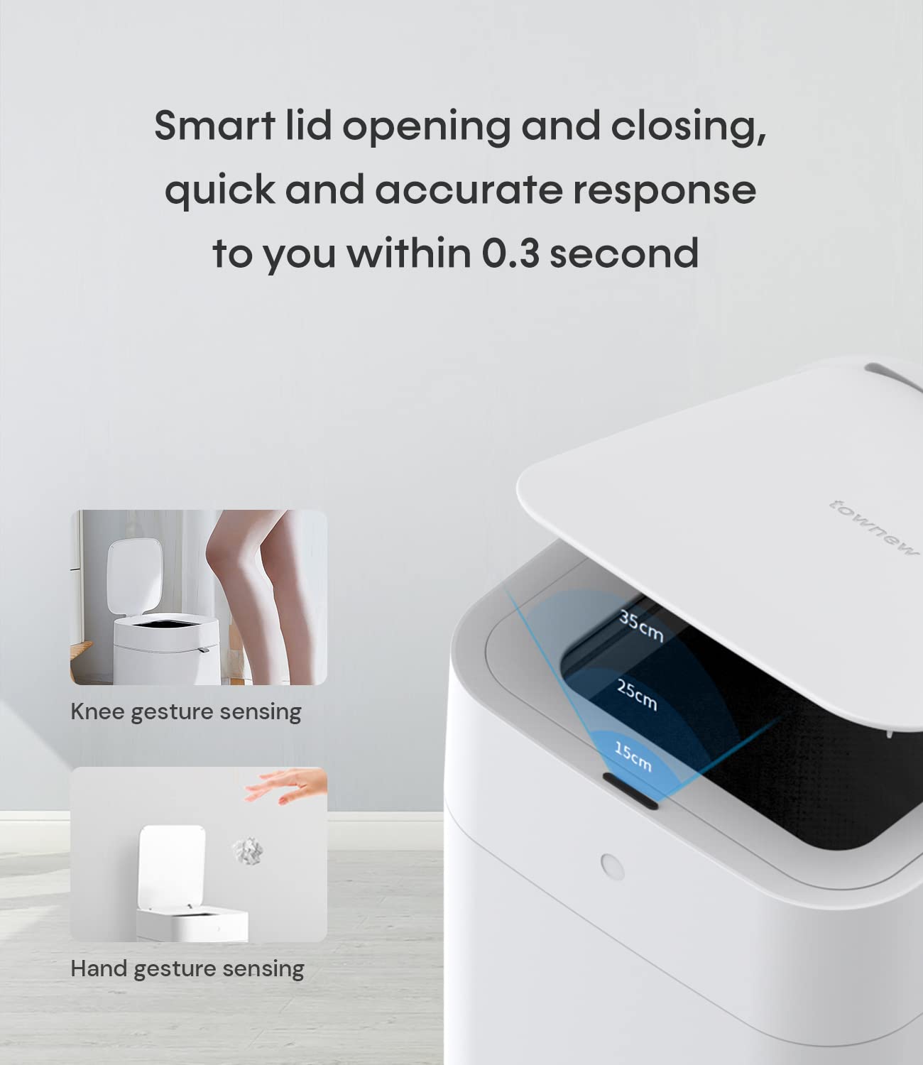 - 【Touch-free Motion Sensor Lid】The automatic garbage can is equipped with latest Infrared Motion Sensor that detects movement and all approaching objects within 14 inches above the sensor panel to open the lid immediately. 【Lid Opening Mode by One-Click Button】The townew smart trash can tap the touch button on the front to instantly turn on lid opening mode and press the button again to turn off lid opening mode.