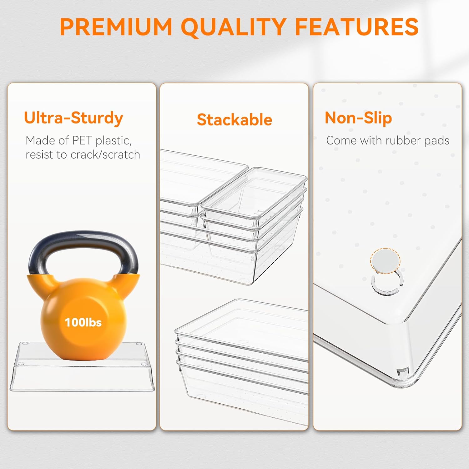 • 【FOOD-GRADE QUALITY】Crafted from premium PET plastic, our desk drawer organizers are twice as sturdy as other fragile ones, and resistant to cracks and scratches. No smells, and safe as food storage, refrigerator pantry organizer and storage. (If quality fails, we'll provide you with a new complete set.)